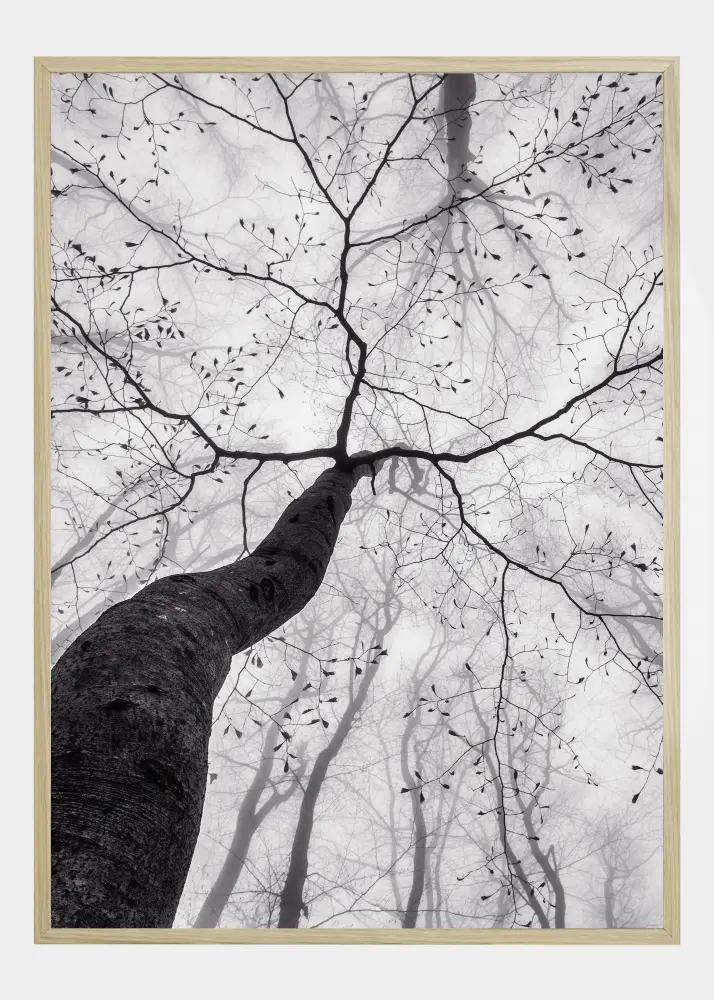 Luontojuliste, jossa puunrunko kurkottaa taivaalle. Katso ylös runkoa pitkin oksia, jotka levittäytyvät taivasta vasten. Pehmeästi tarkennetut puut täyttävät taustan lehdillään. Lisää tämä mustavalkoinen otos seinällesi ja tunne luonnon rauhallisuus.
