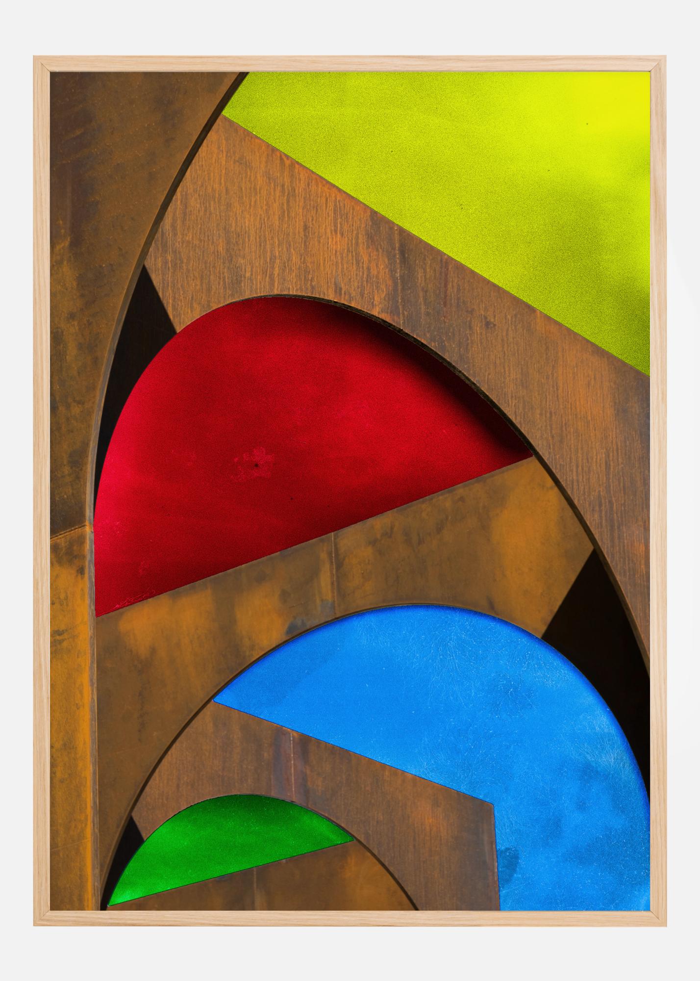Kirkas abstrakti juliste värikkäistä muodoista. Päävärit täyttävät tämän teoksen punaisilla, keltaisilla ja sinisillä puoliympyröillä. Näiden muotojen välissä on suorareunaisia puuefekteillä olevia muotoja, joiden alaosassa on vihreä puoliympyrä. Lisää eloisuutta tavalliseen seinään tai sovita olemassa olevaan rohkeaan väriin täydellisen ilmeen aikaansaamiseksi.