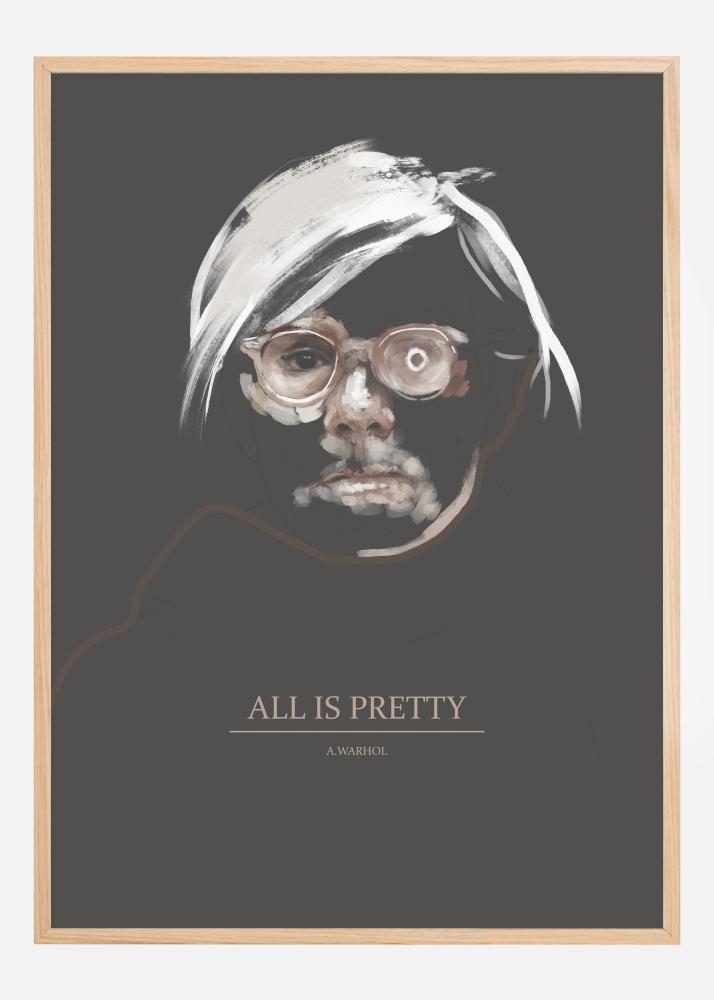 Taitelijajuliste Andy Warholista. Tässä taiteilijan muotokuvassa näkyy hänen valkoinen tukkansa mutta keskittyen hänen silmiinsä, joista toinen on rauhallinen ja toinen villi. Alareunassa on iskulause All is Pretty, joka antaa sinulle inspiroivan lainauksen ja viestin aina, kun kävelet tämän ohi kotonasi.
