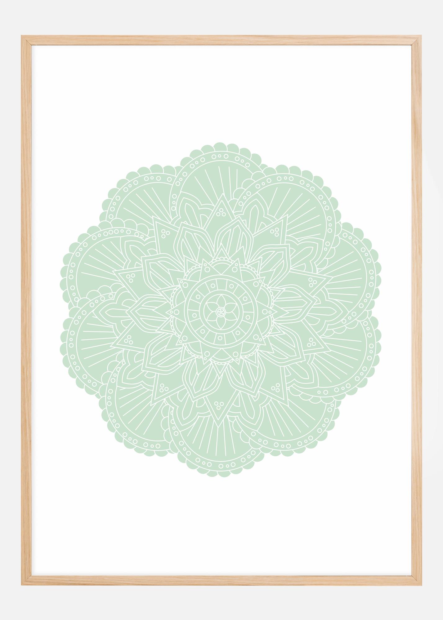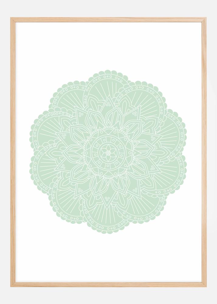 Tämä juliste esittää symmetrisen mandalan rentouttavissa vihreän sävyissä, kuva, joka on sekä visuaalisesti houkutteleva että symbolisesti rikas. Mandala, tunnettu käytöstään meditaatiossa ja rentoutumisessa, tarjoaa monimutkaisen kuvion, joka kutsuu silmän tutkimaan ja mielen vaeltamaan. Pehmeät sävyt edistävät tasapainon ja harmonian tunnetta, mikä tekee tästä taideteoksesta täydellisen kehyksen mietiskelylle ja rauhalle.