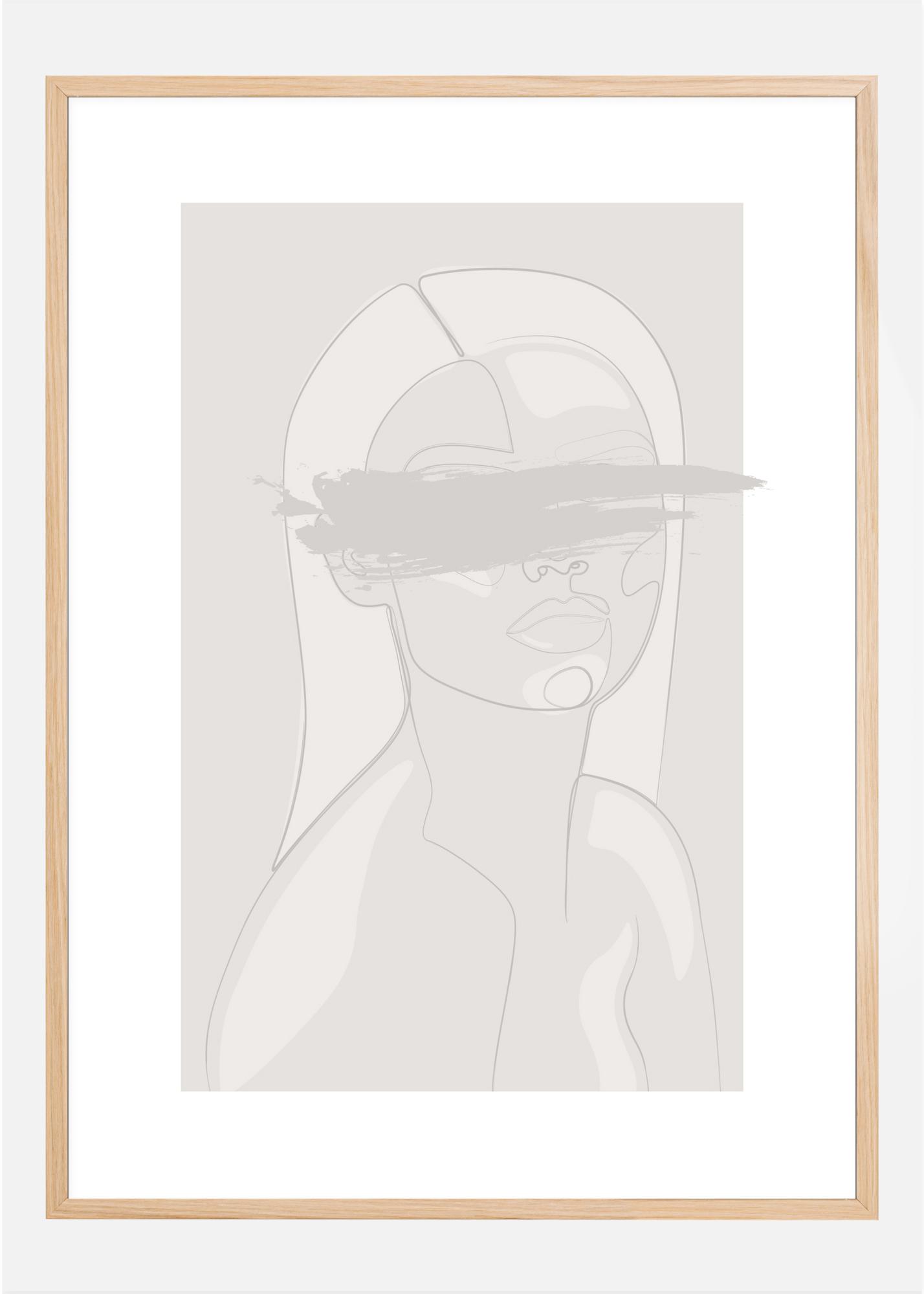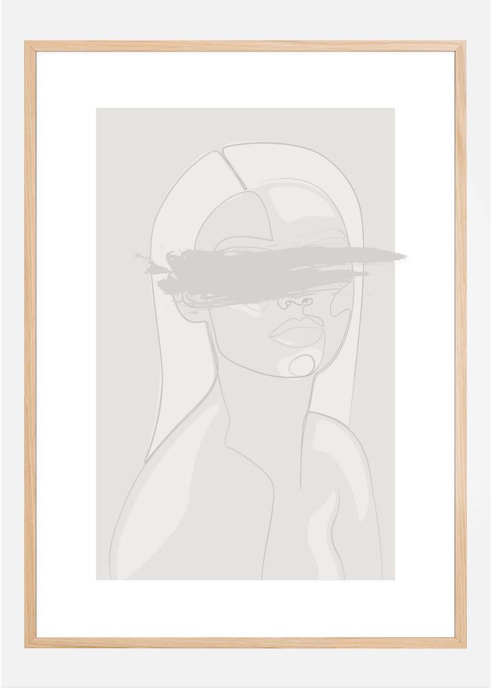 Abstrakti juliste naisesta, jonka silmät on peitetty. Tässä vaalean valkoisessa ja harmaassa teoksessa hahmotellaan naisen pää ja hartiat lohkomuotoisina ja viivamaisina. Maaliroiske peittää hänen silmänsä luoden naisen ympärille salaperäisyyttä. Vahva valkoinen reunus kehystää naista, ja se sopii täydellisesti kodin rohkean yksivärisen seinän täydentäjäksi.