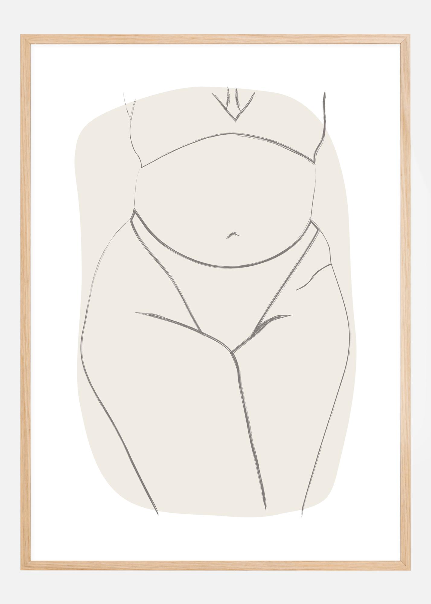Yksinkertainen juliste, jossa on piirros naisen vatsasta ja jaloista. Vaatimattomassa asennossa viivat näyttävät naisen ristissä olevat jalat, kun hänellä on yllään yksinkertaiset bikinit. Vaaleanharmaalla korostetut vahvat viivat erottuvat ja luovat taiteilijan työn. Yhdistä värilliseen seinään erottuvan ilmeen luomiseksi.