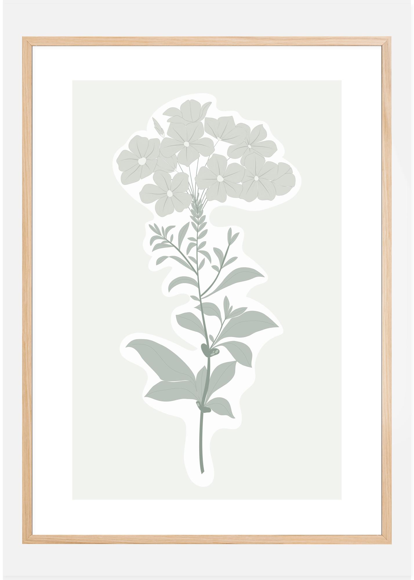Kukkajuliste, jossa on yksinkertainen kasvitieteellinen painatus kukasta ja sen lehdistä. Pehmeät harmaanvihreät värit muodostavat tämän yksinkertaisen, mutta tyylikkään kukkien varren. Teos on kehystetty valkoisella ja harmaalla; tämä herättää henkiin vanhan tyyliset kasvitieteelliset kuvitukset. Esittele puutarhapaikkaasi tällä ihastuttavalla teoksella.