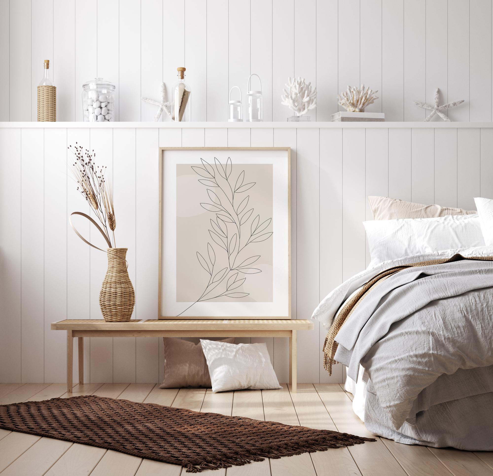 Yksinkertainen printtijuliste lehdistä harmaalla pohjalla. Seuraa tämän yksinkertaisen lehtipiirroksen käyrää, kun se johdattaa katseesi teoksen ympäri. Vaaleanharmaa ympyrä on aurinko tässä harmaan sävyisessä teoksessa. Lisää kirkas tausta tuomaan tähän teokseen väriä ja elämää.