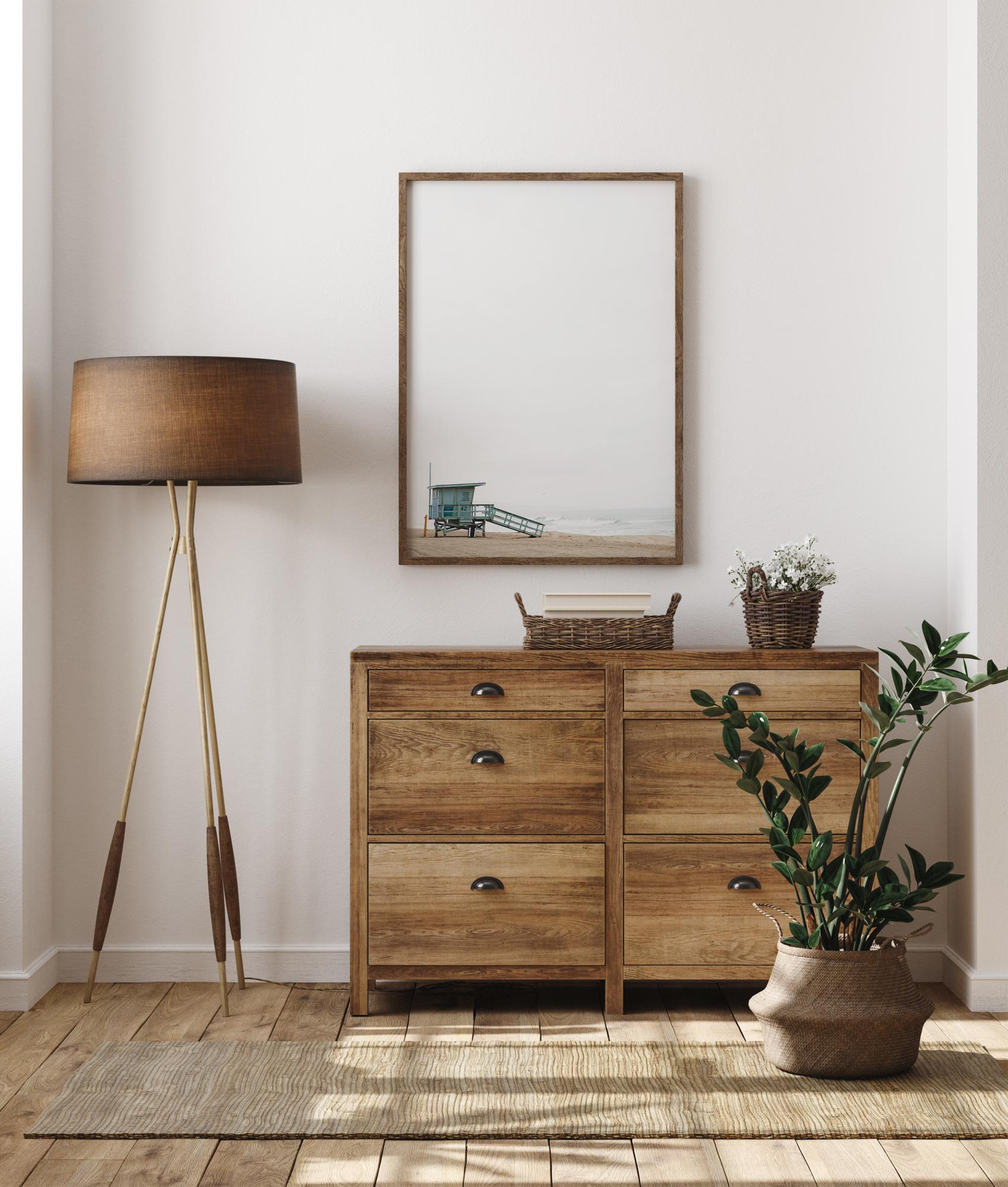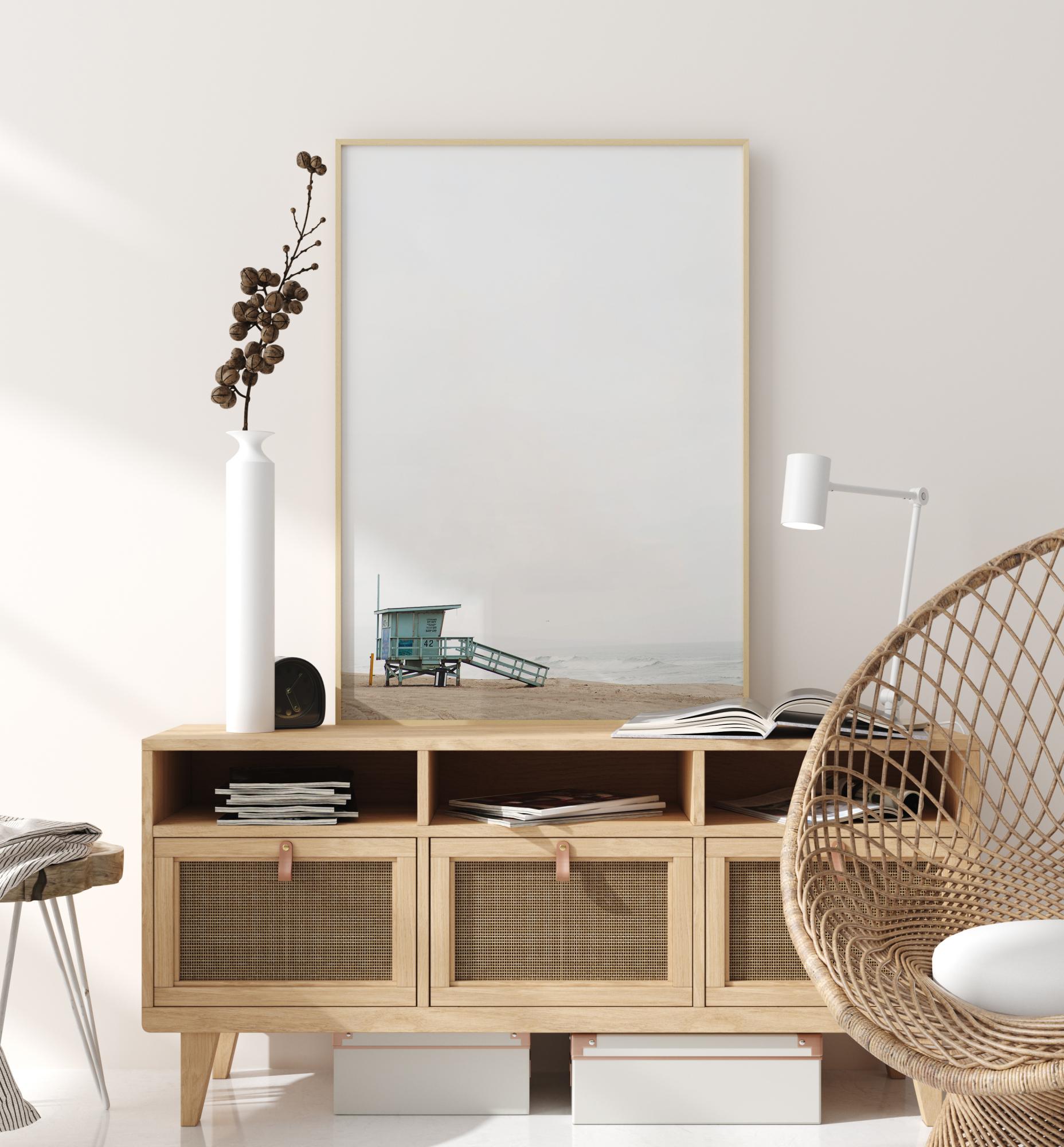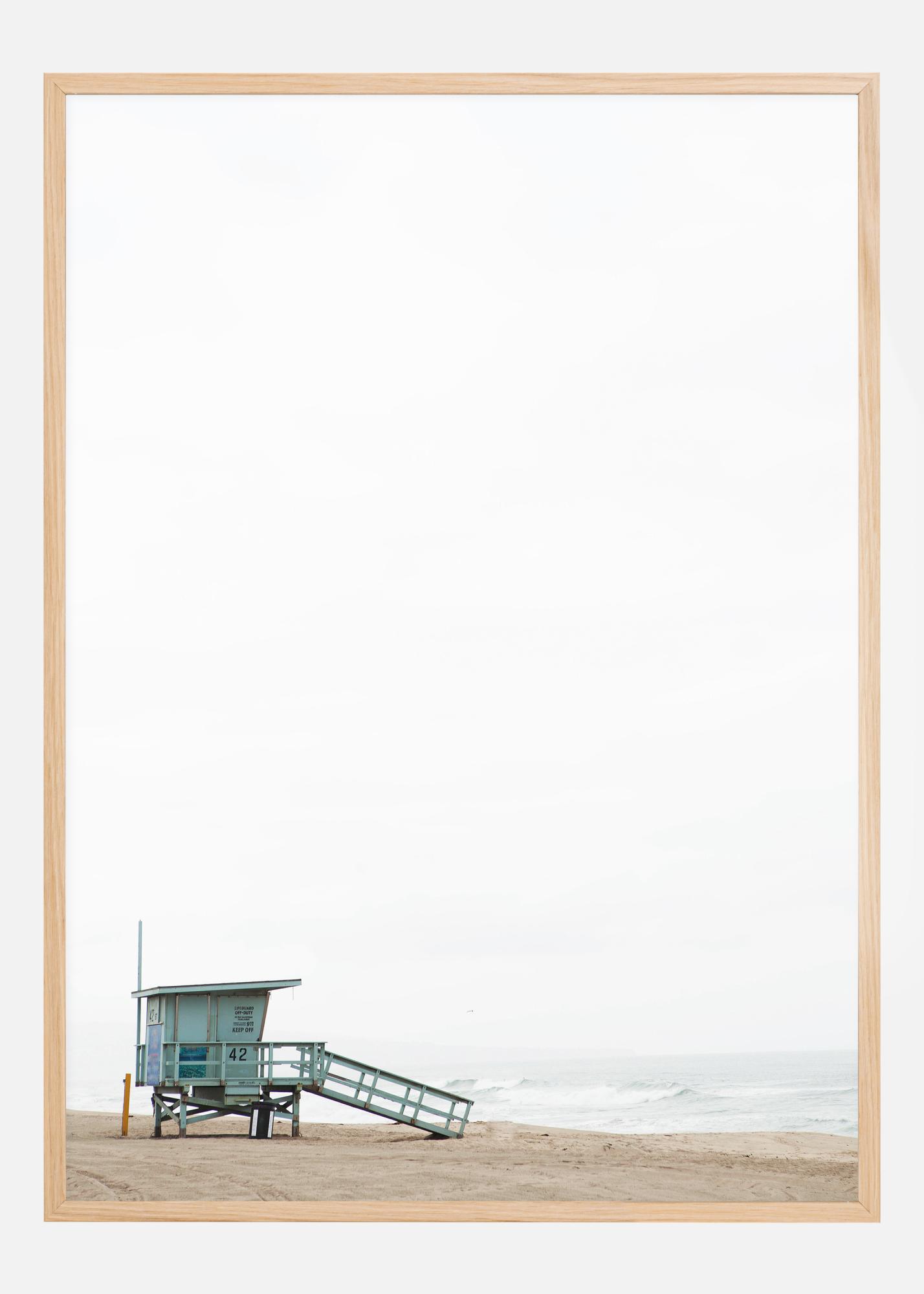 Minimalistinen juliste hengenpelastajan majasta rannan reunalla. Valkoinen taivas levittäytyy korkealle majan yläpuolelle luoden pienuuden tunteen, kun taas majan ramppi johdattaa katseen alas mereen. Luo valtavan tilan tunne, kun ripustat tämän.