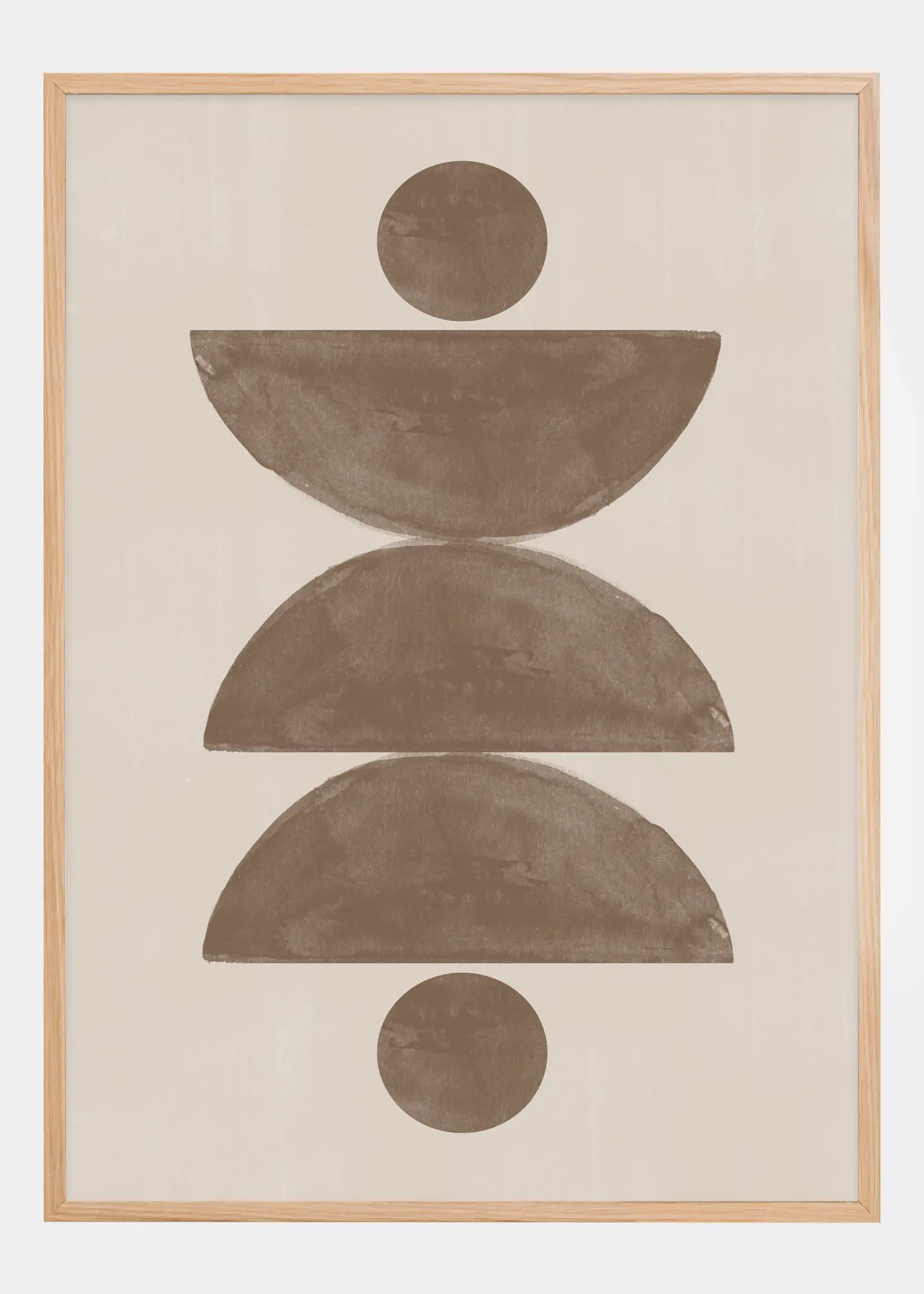 Tämä rauhoittava ja esteettisesti miellyttävä juliste esittelee harmonisen kasan pehmeitä geometrisiä muotoja. Kaksi puolikuuta maanläheisessä ruskeassa sävyssä tasapainottavat kahta täyttä ympyrää, jotka ovat sijoitettu symmetrisesti ylä- ja alapuolelle. Tämä minimalistinen sommitelma tarjoaa rauhan tunteen ja on täydellinen esitys boheemista tyylistä pehmeällä ja modernilla vetovoimalla.