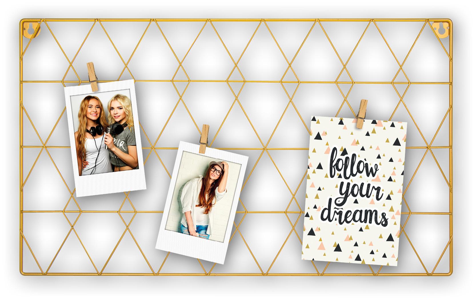Kollaasikehys on muotoiltu ilmoitustauluksi, johon kiinnität kuvasi klipseillä. Kehys on valmistettu metallista ja on sävyltään kultainen. Koska kiinnität kuvasi itse, voit yhdistää eri kokoisia kuvia ja myös laskea valloilleen luovuutesi ja kiinnittää esimerkiksi pienempiä julisteita tai hienoja lappuja! Kehyksen ulkomitat ovat 50x30 cm. Tämä kehys sopii erityisen hyvin kirjoituspöydän yläpuolelle, keittiöön tai johonkin muualle, jossa se voi päästä koristeellisiin ja toimiviin oikeuksiinsa. Sisältää seinäkiinnikkeen.