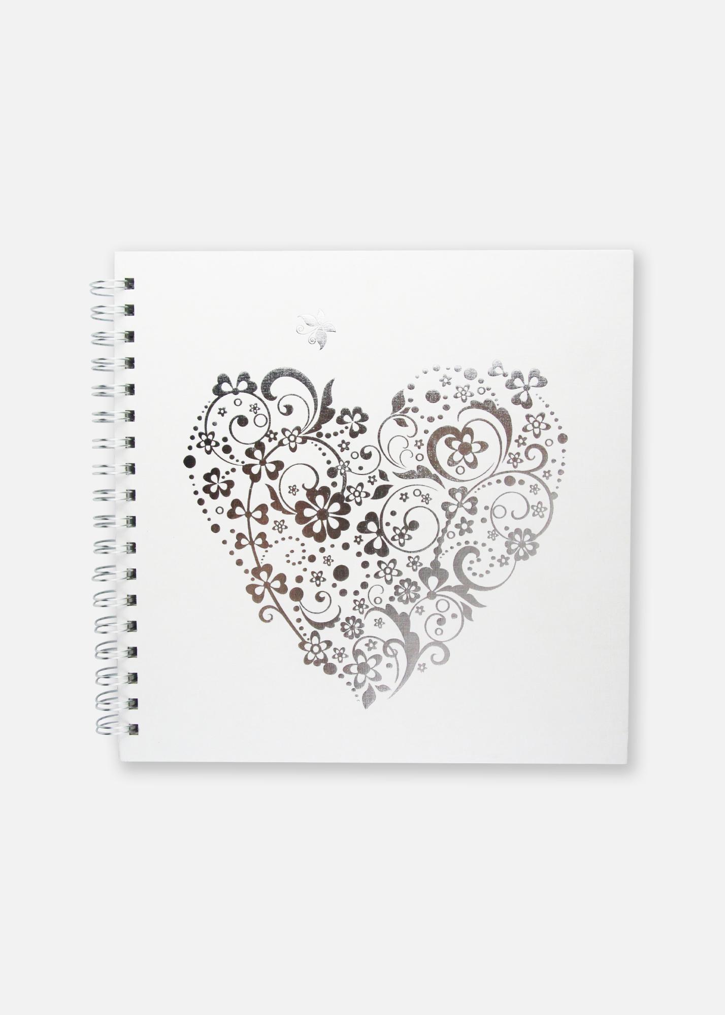 Söpö valkoinen kierrealbumi 25x25 cm -koossa. Etupuolella hopeinen sydän, jossa sievät painetut kukkaiset yksityiskohdat. Albumissa on 24 happovapaata valkoista arkkia ja se on täydellinen albumi, jonka voit antaa olla pöydällä kuvien selailua varten ilman, että se vie liikaa tilaa.