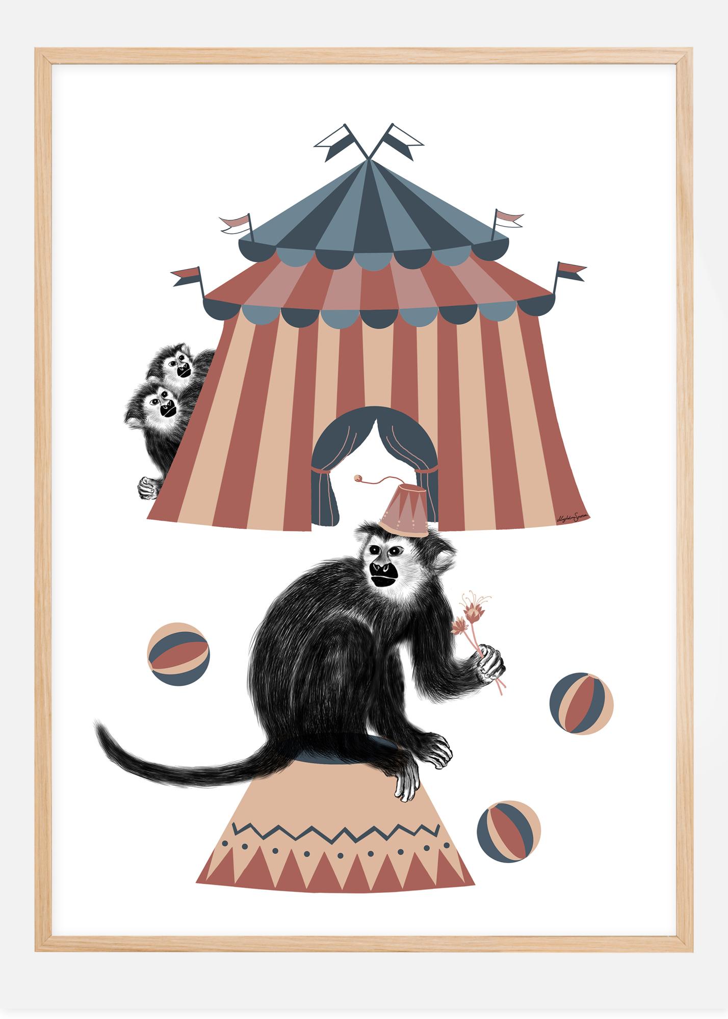 Hauska juliste sirkuksesta, jossa on apinoita ja sirkusteltta. Apina istuu jakkaralla päällään fetsi ja kädessään kukkia. Kolme palloa on ympärillä. Kaksi muuta apinaa piileskelee sirkusteltan takana. Luo kotiisi omituista tunnelmaa, kun lisäät tämän seinälle.