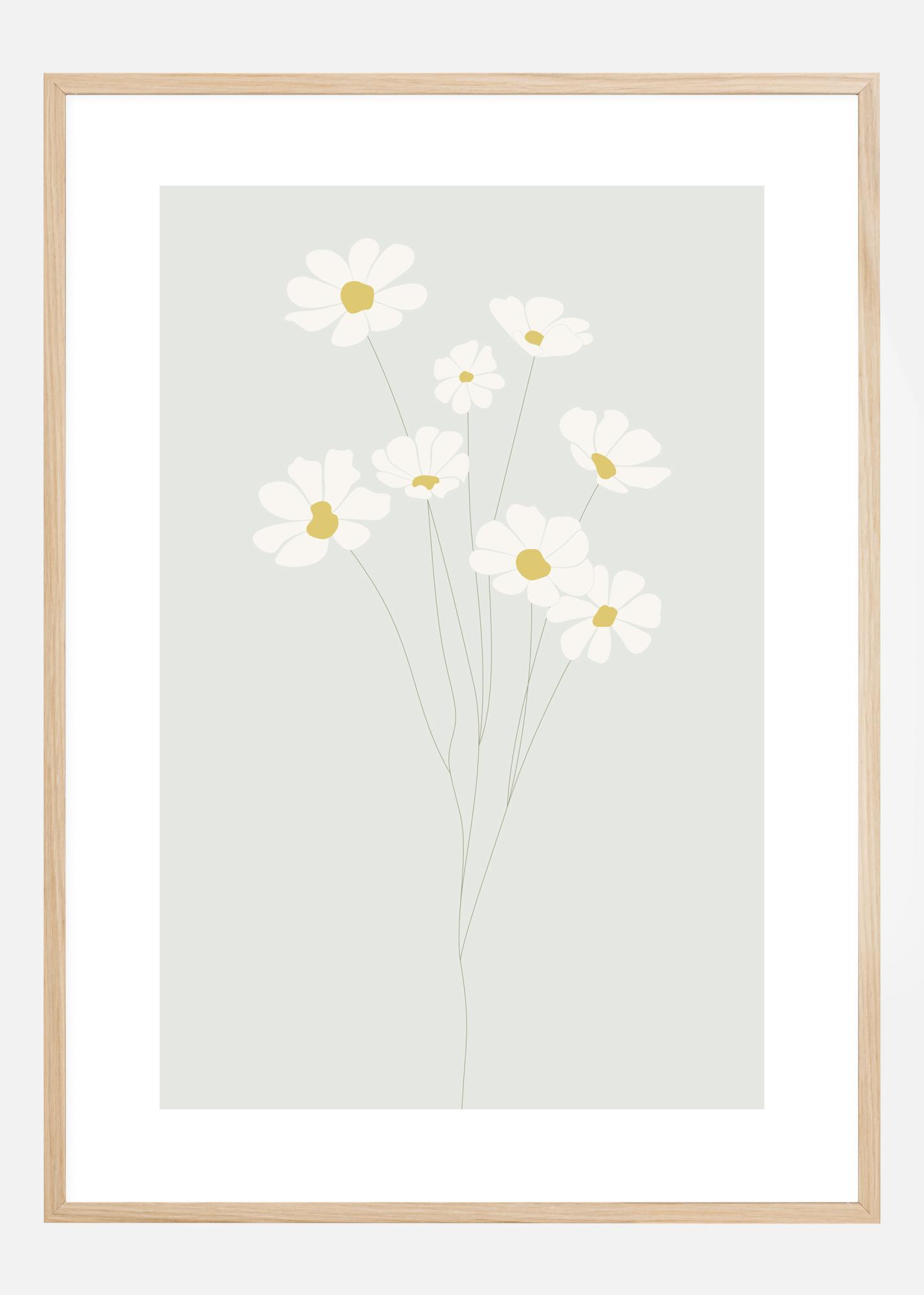 Hienovarainen juliste, jossa on herkkä päivänkakkarapainatus. Yksinkertaiset valkoiset ja keltaiset kukat kurottautuvat ylöspäin hoikkia varsia pitkin ja asettuvat pehmeälle vaaleansiniselle taustalle. Lisää tämä lasten makuuhuoneeseen, jotta saat pehmeän, mutta söpön tunnelman lapsille.