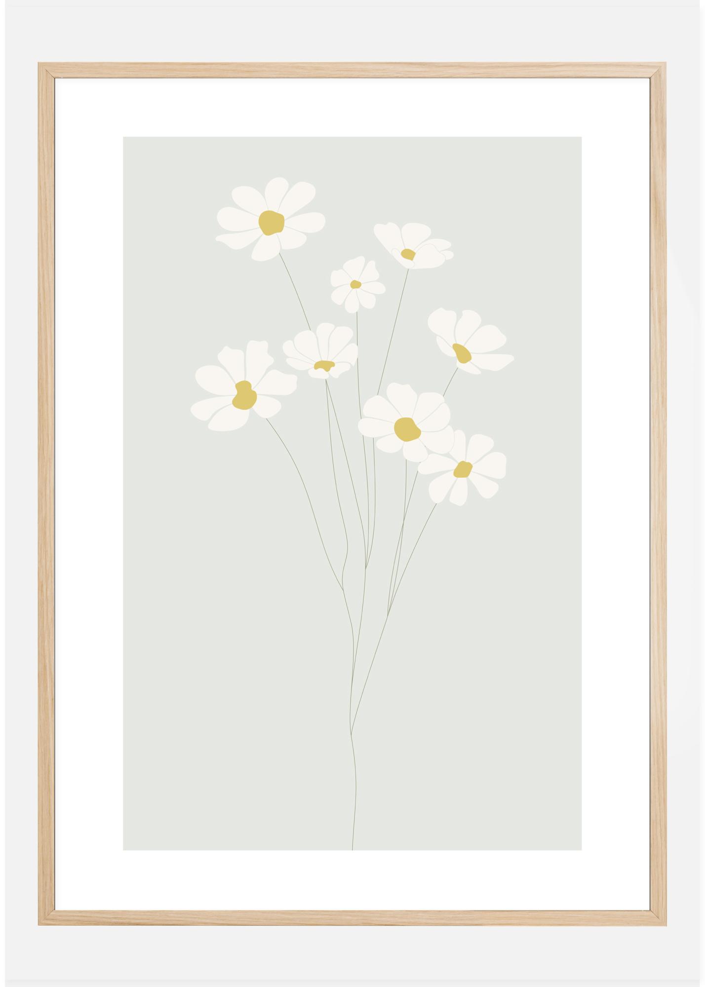 Hienovarainen juliste, jossa on herkkä päivänkakkarapainatus. Yksinkertaiset valkoiset ja keltaiset kukat kurottautuvat ylöspäin hoikkia varsia pitkin ja asettuvat pehmeälle vaaleansiniselle taustalle. Lisää tämä lasten makuuhuoneeseen, jotta saat pehmeän, mutta söpön tunnelman lapsille.