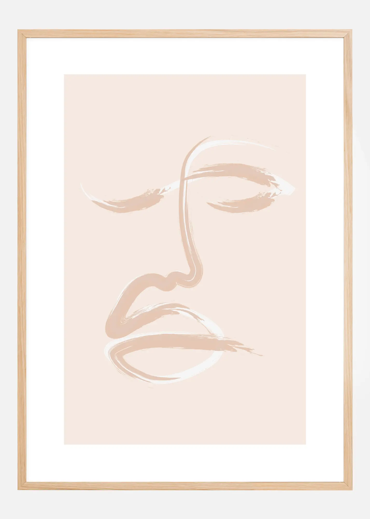 Abstrakti muotokuvajuliste, jossa kasvot on luotu rohkeilla vaaleanpunaisilla siveltimenvedoilla. Yksi ainoa siveltimenveto pyörähtää sivun poikki muodostaen nenän ja suun. Silmät on lisätty tavalla, joka on lähes silmänisku. Valkoisen reunuksen avulla saat tämän erottumaan pastellisella seinällä.