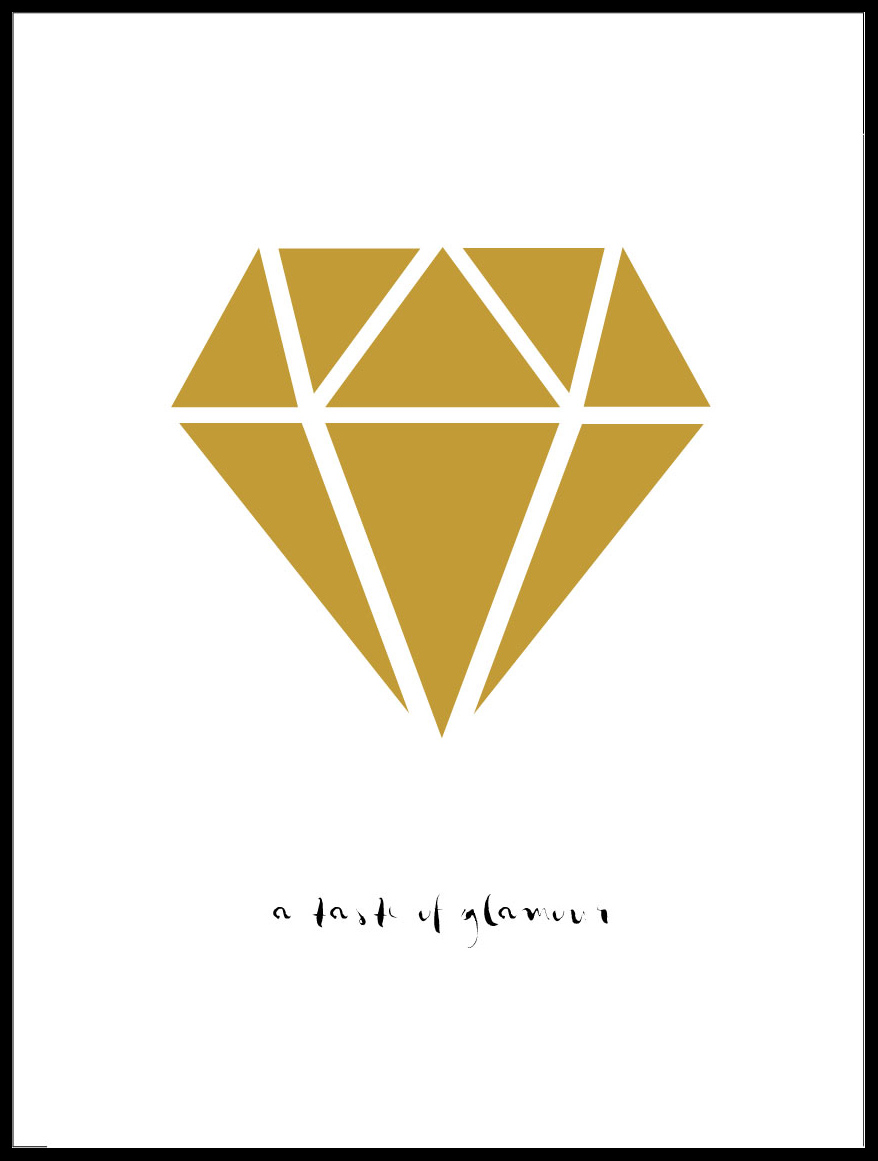Diamonds are a girl’s best friend, vaikka tässä ne tulevat eri muodossa graafisena painatuksena. Tuo kotiin ripaus luksusta ja laita kullan sävyissä leikkivä teos seinälle. Sen viimeistelee teksti ”a taste of glamour”. Jokainen tarvitsee joskus hieman glamouria ja tämä on todella yksinkertainen tapa luoda sitä.Aihe on painettu valkoiselle 240 g korkealaatuiselle mattapintaiselle paperille parhaan värilaadun toteuttamiseksi. Mattapaperi tuo kuvaan ripauksen luksusta ja korostaa kauniisti aihetta.Kehys ei sisälly tuotteeseen, mutta se on mahdollista tilata erikseen.