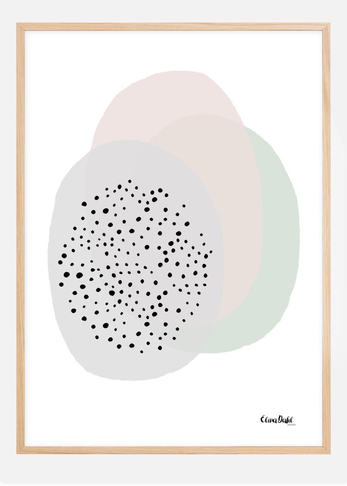 Taiteellinen juliste, jossa on oudon muotoinen, kolmesta eri väristä koostuva pallo, joista yhdessä on sarja pieniä mustia pisteitä. Päällekkäisten muotojen sininen, vaaleanpunainen ja vihreä antavat pehmeän lisän tähän abstraktiin kuvaan. Saat ne erottumaan paremmin valitsemalla samanvärisen seinän, johon tämä teos kiinnitetään.