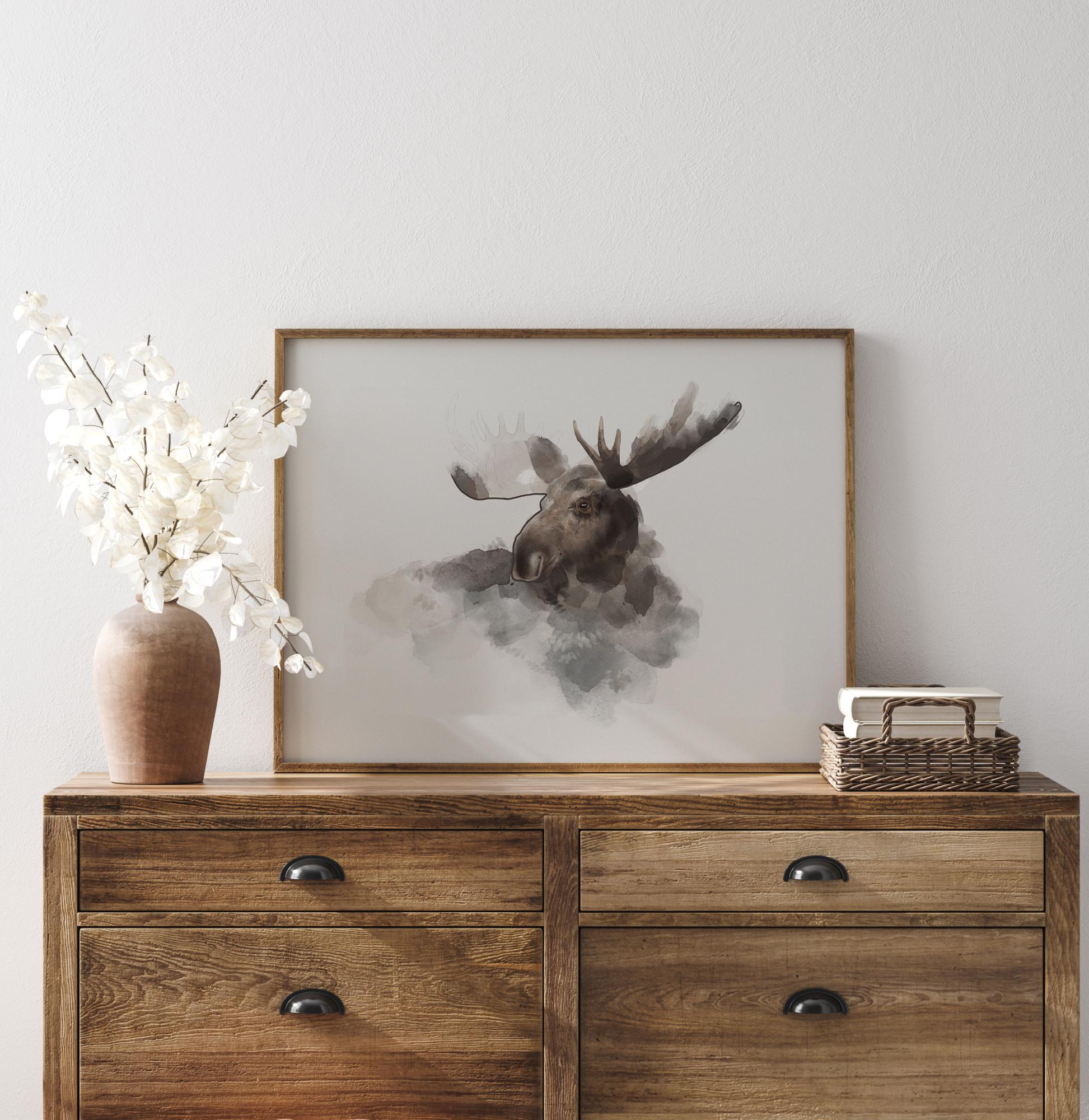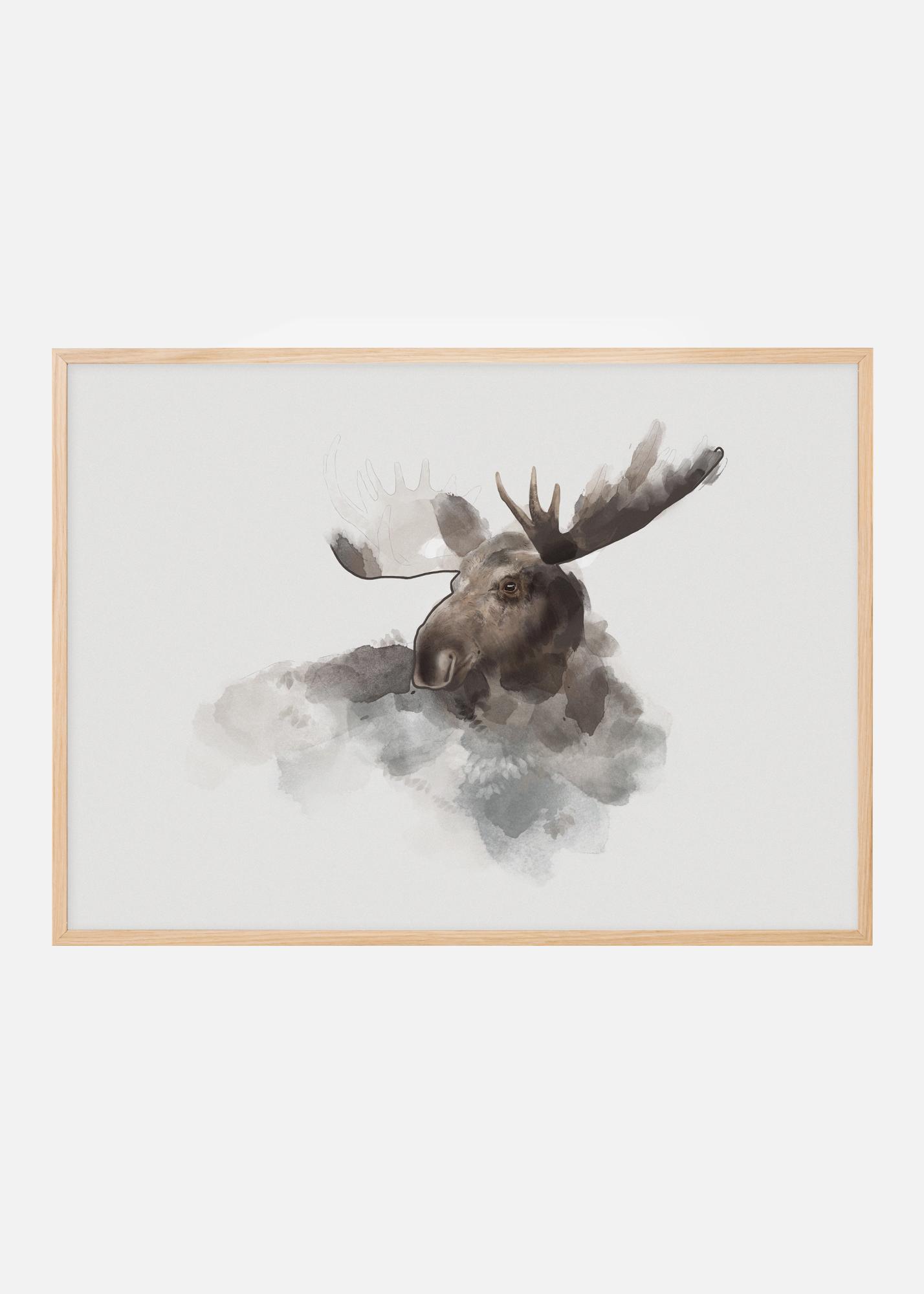 Akvarellijuliste hirven päästä. Pehmeät vesivärisiveltimet rakentavat vähitellen hirven kasvot, jonka sarvet eivät ole vielä täysin muotoutuneet. Lisää tämä pilvimäinen kuva pehmeälle neutraalille seinälle, jotta kodin sisustuksessa säilyy pehmeä eleganssi.