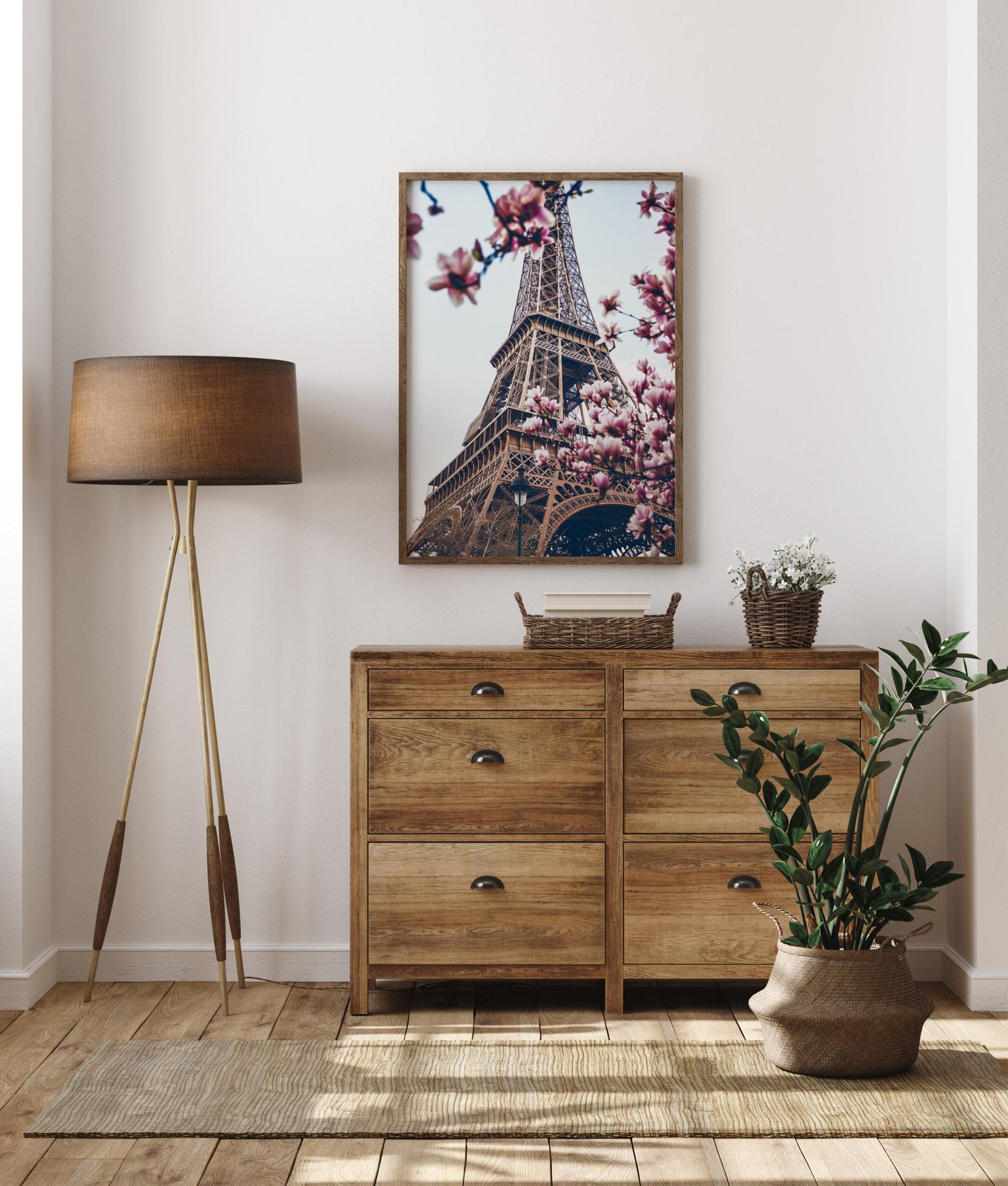 Rauhoittava taidevalokuva Eiffel-tornista, jossa etualan kauniit magnoliat tuovat kuvaan ihanaa hohtavaa valoa ja hienoa syvyyttä. Romanttinen juliste, joka on helppo yhdistää muihin suosikkeihin.