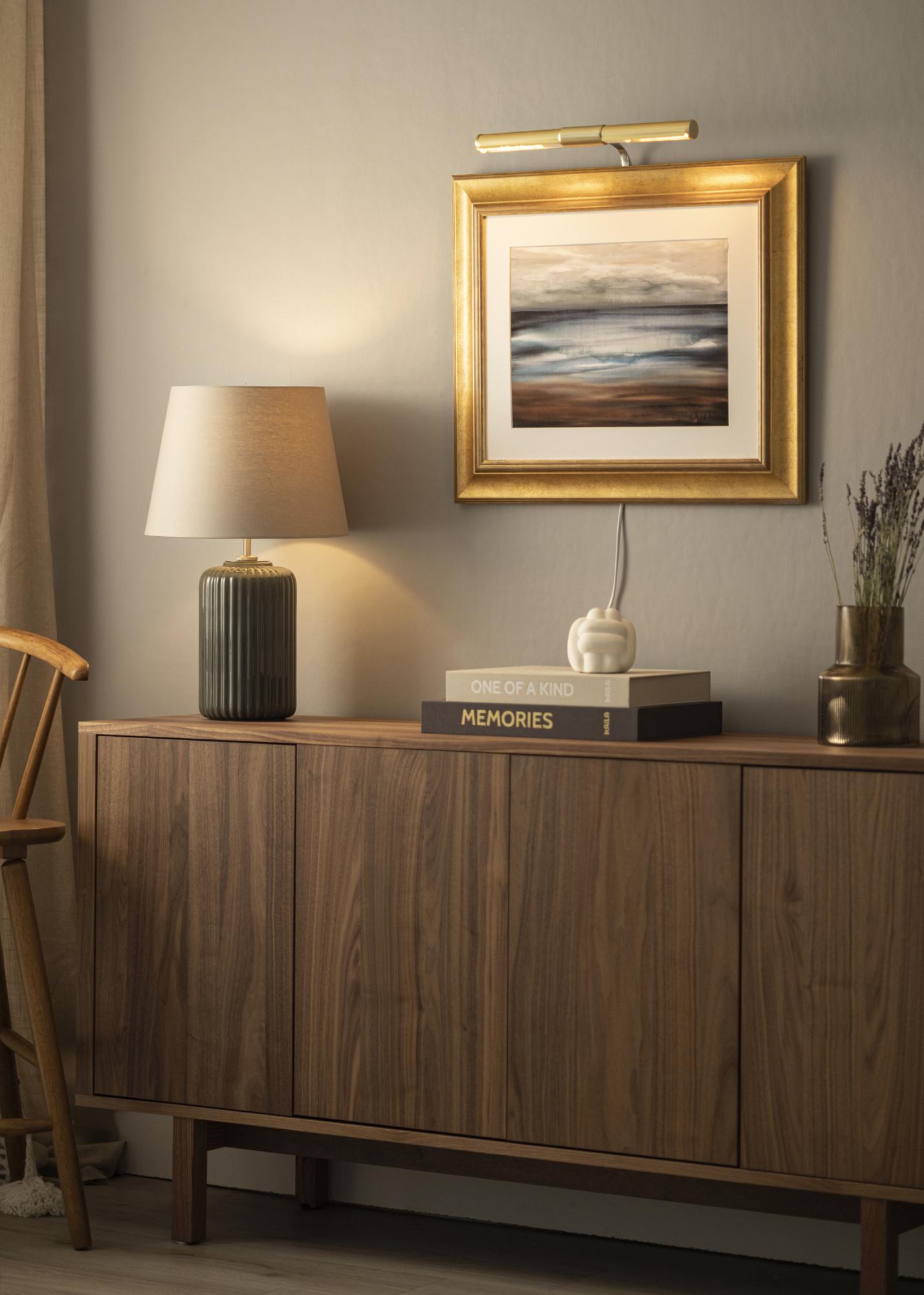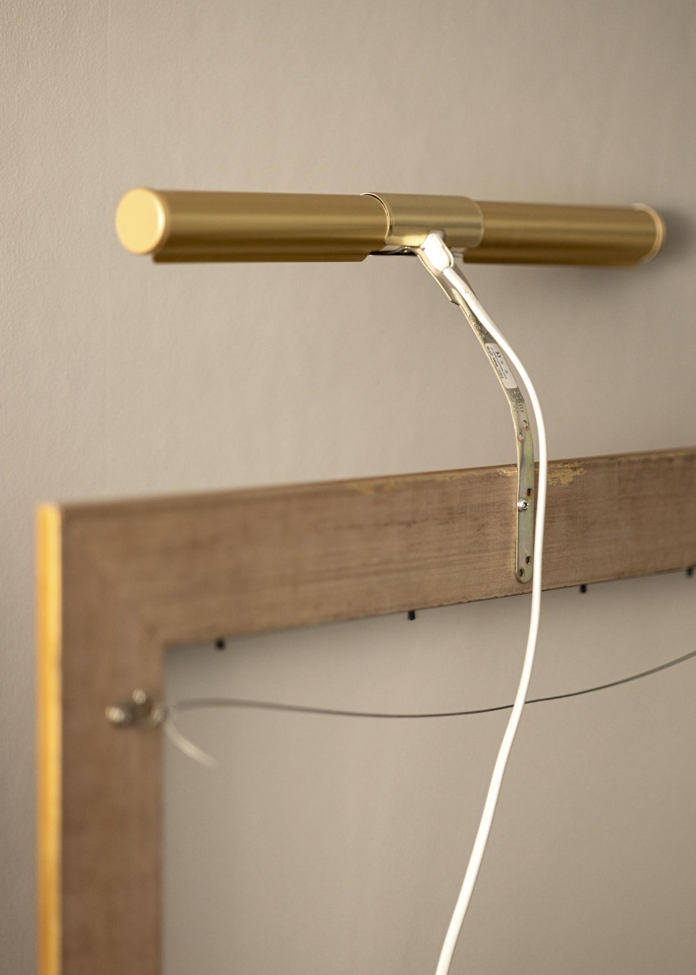 Normaalisti kiinnität taulun valaisimen kehyksen takaosaan, mutta tämä vaatii useimmiten leveäprofiilisen puukehyksen jotta voit ruuvata valaisimen kiinni. Seinäkiinnityksellämme sinun ei tarvitse huolehtia siitä, koska tauluvalaisin asennetaan suoraan seinälle taulun taakse.