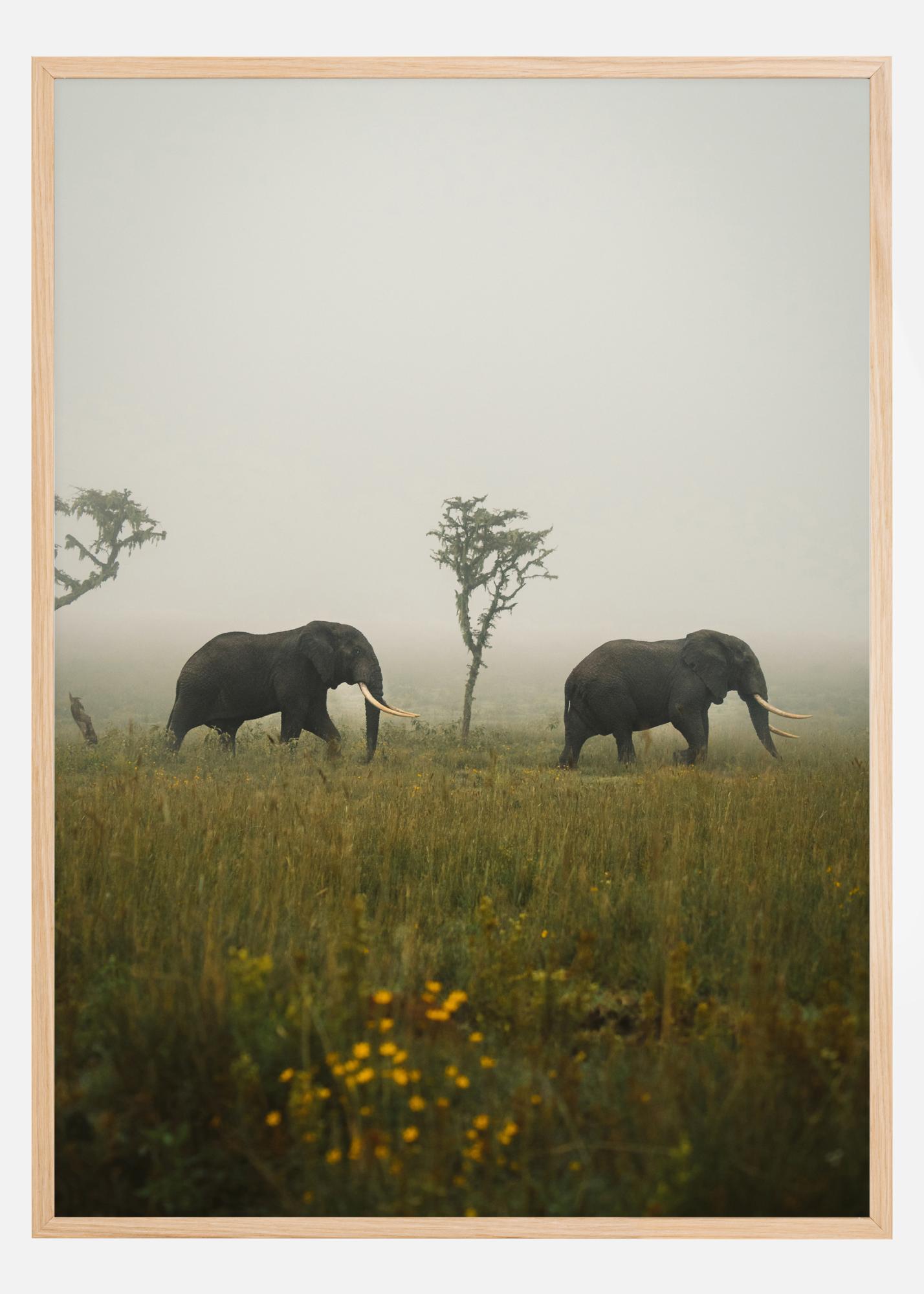 Luontokuva parista elefanteista, jotka vaeltavat korkeassa ruohossa karujen puiden välissä. Taustan tiheä sumu luo teräviä kontrasteja, jotka korostavat suuria eläimiä erityisen selvästi. Juliste niille, jotka rakastavat savannia ja sen suurimpia asukkaita!