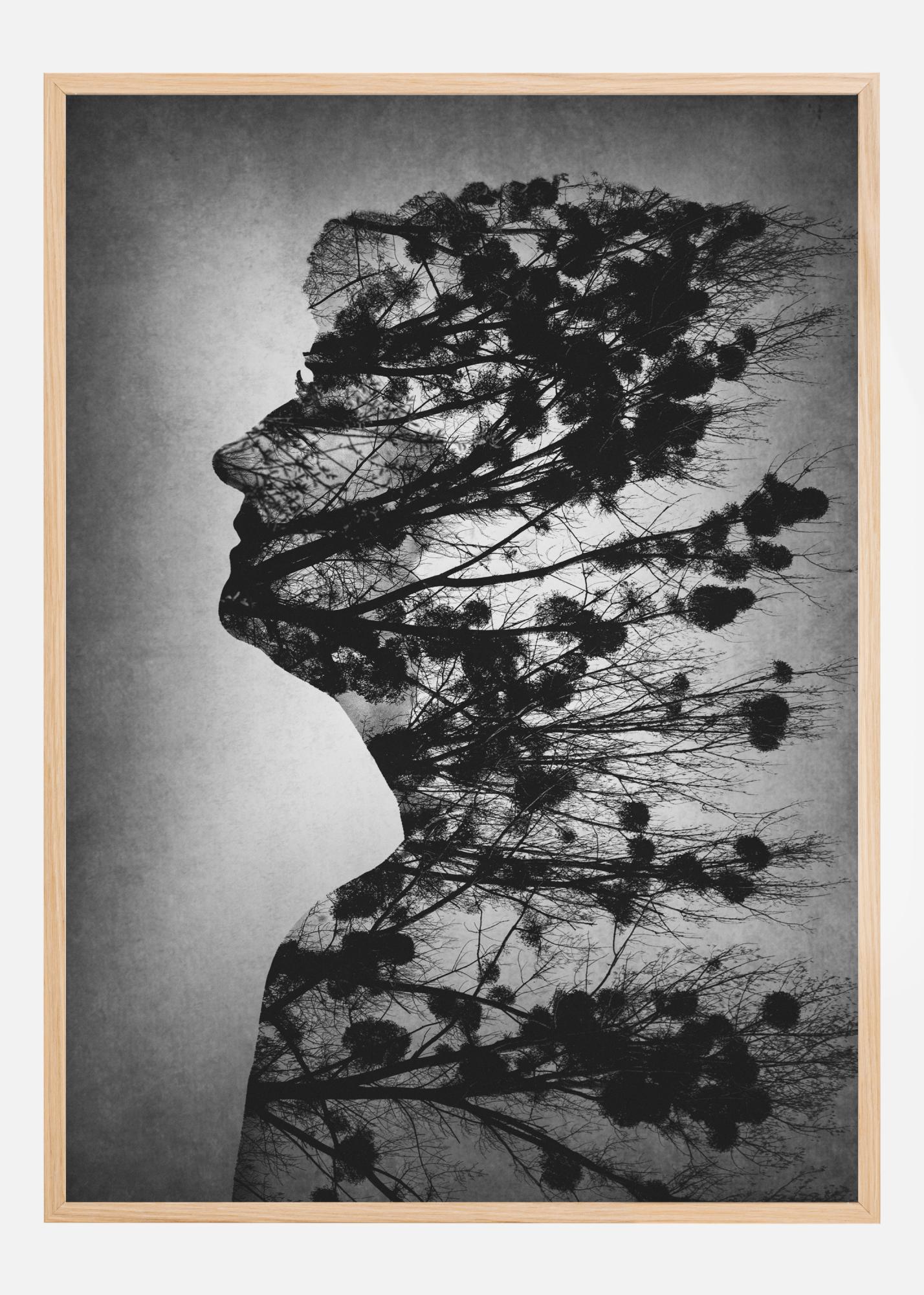 Abstrakti juliste naisen kasvoista, joka on luotu käyttämällä erilaisia lehtiä ja oksia. Upeassa mustavalkoisessa kuvassa tämä dramaattinen poseeraus saa aikaan tunteen, että tuuli on puhaltanut lehdet naisen kasvoille. Voimakas taustavalo korostaa naisen profiilia, mikä antaa kuvasta voimakkaan, mutta läpinäkyvän vaikutelman.