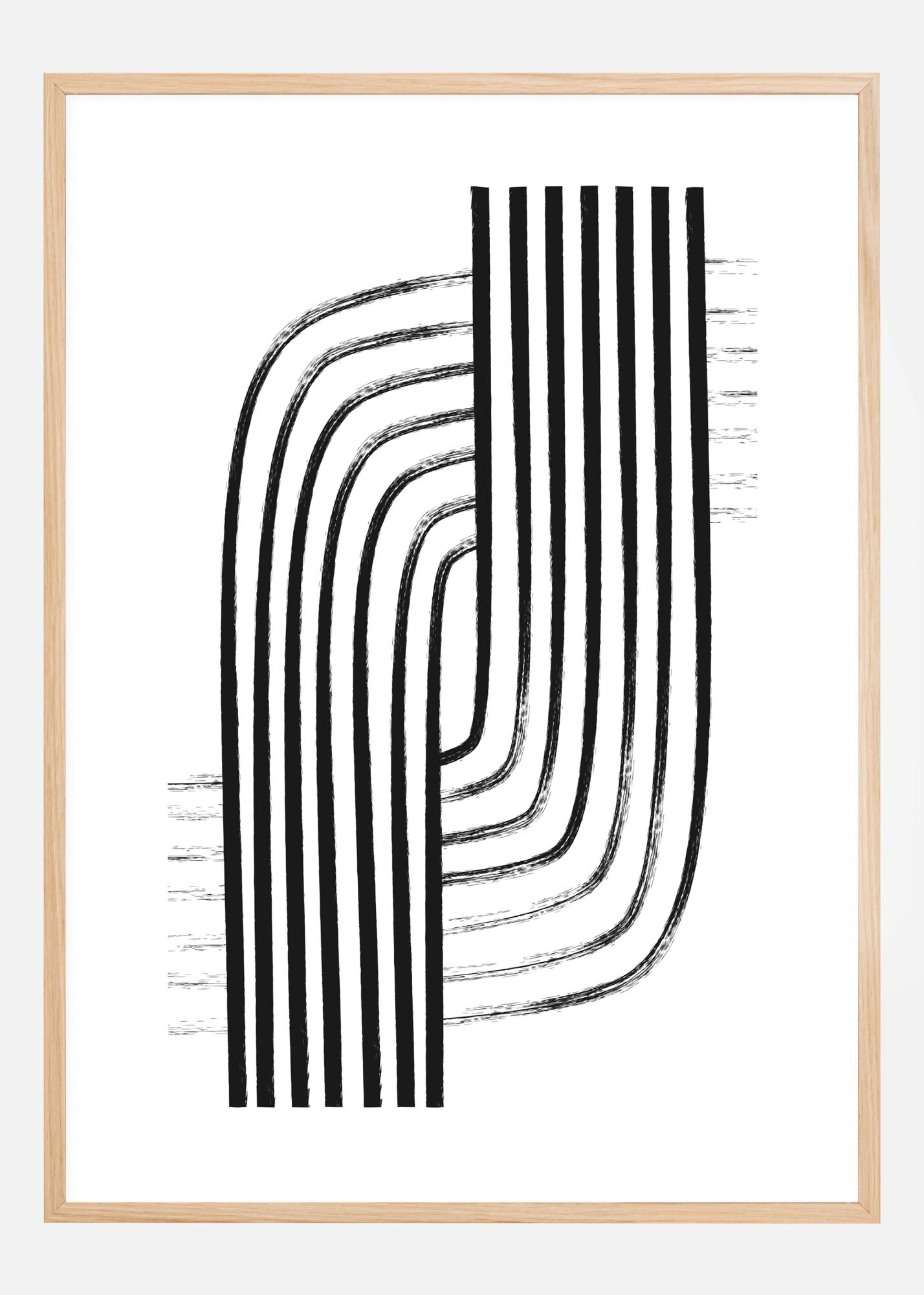 Yksinkertainen juliste mustista viivoista, jotka muodostavat kuvion. Kuva koostuu seitsemästä mustasta viivasta, jotka kulkevat suoraan ylöspäin, kaartuvat ja häipyvät. Toinen joukko viivoja peilaa ensimmäistä, mutta kulkee vastakkaiseen suuntaan. Tee kodistasi galleria tämän kokeellisen teoksen avulla.
