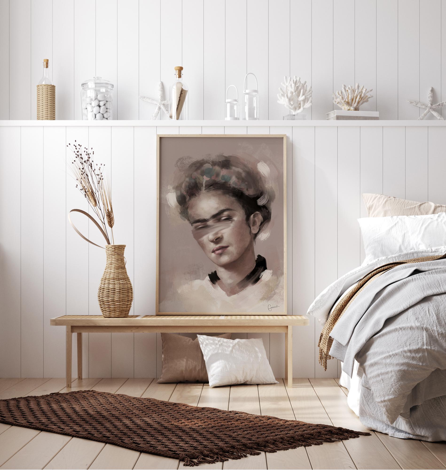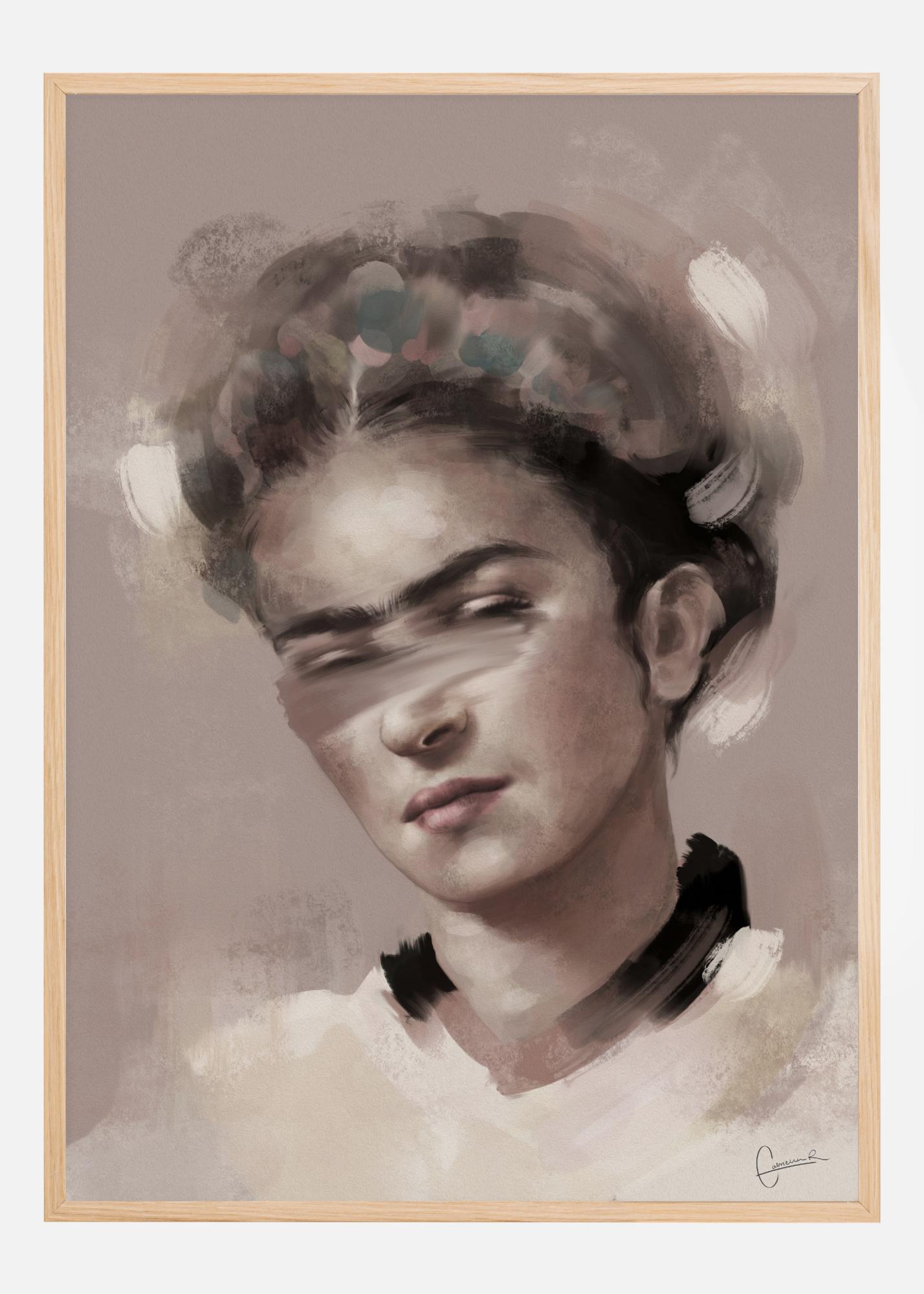 Pehmeällä maalilla tehty muotokuvajuliste Frida Kahlosta. Rauhallinen ja seesteinen, kun tämä nainen katsoo alaspäin rauhallinen ilme kasvoillaan. Hänen hiuksensa ja ihonsa ovat pehmeän neutraaleja sävyjä, jotka lisäävät hänen melkein enkelimäistä tunnelmaansa. Esittele suosikkitaiteilijoitasi tämän tulosteen avulla.