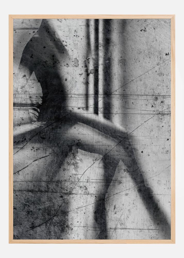 Abstrakti juliste, jossa nainen istuu seinällä. Mustavalkoinen kuva on täynnä viivoja ja pehmeitä reunoja, jotka luovat tämän taiteellisen impressionistisen teoksen. Lisää valkoiselle seinälle dramaattisen ilmeen luomiseksi tai pariksi rohkean värin kanssa saadaksesi lisää dramatiikkaa.