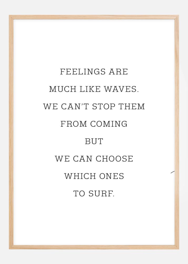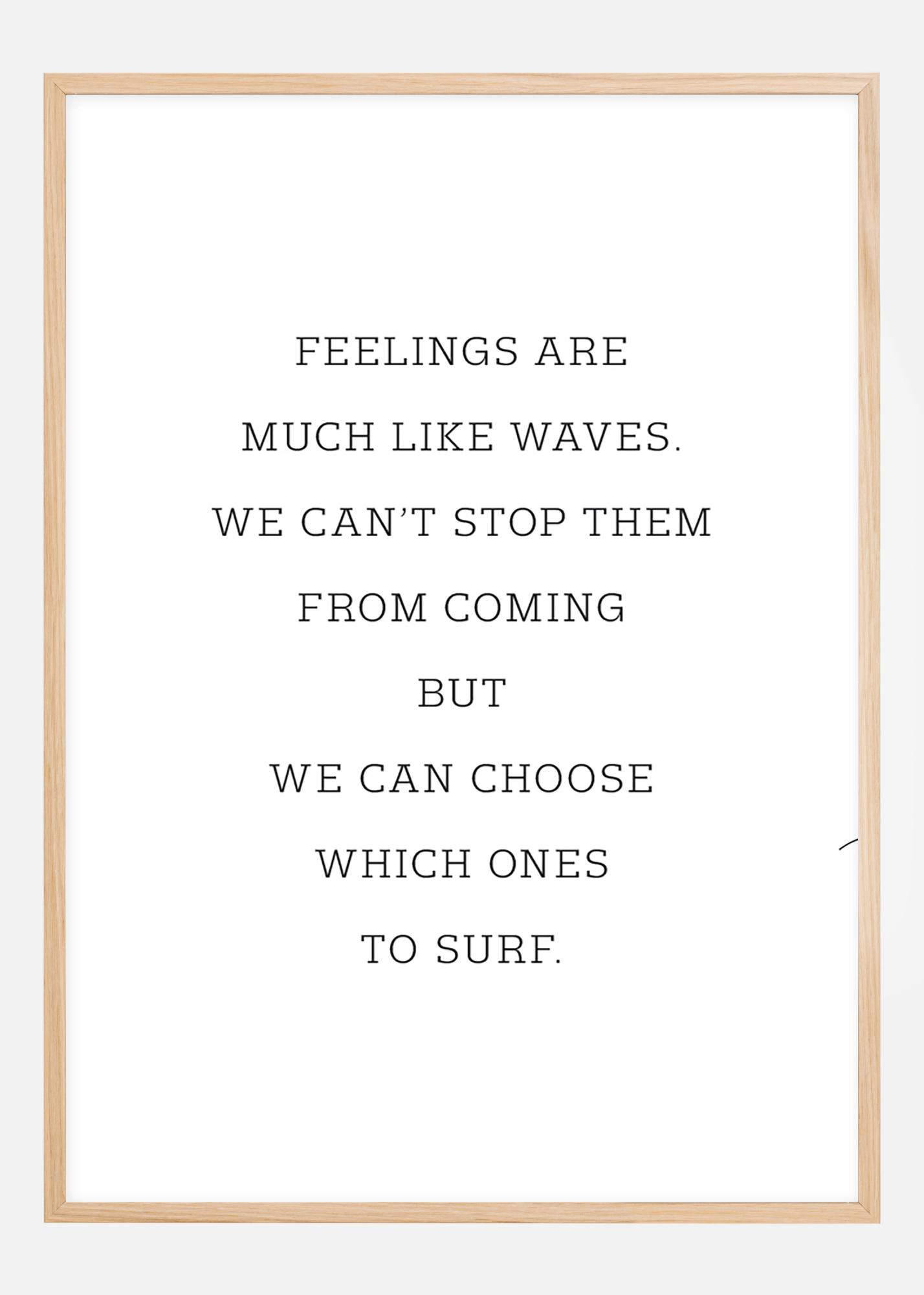 Motivoiva juliste, joka pitää sinut liikkeellä joka päivä. Tunteet ovat kuin aaltoja. Emme voi estää niiden tuloa, mutta voimme valita, millä niistä surffata. Käynnistä päiväsi tällä vahvalla sitaatilla, joka on kirjoitettu yksinkertaisilla kirjaimilla tavalliseen valkoiseen taustaan