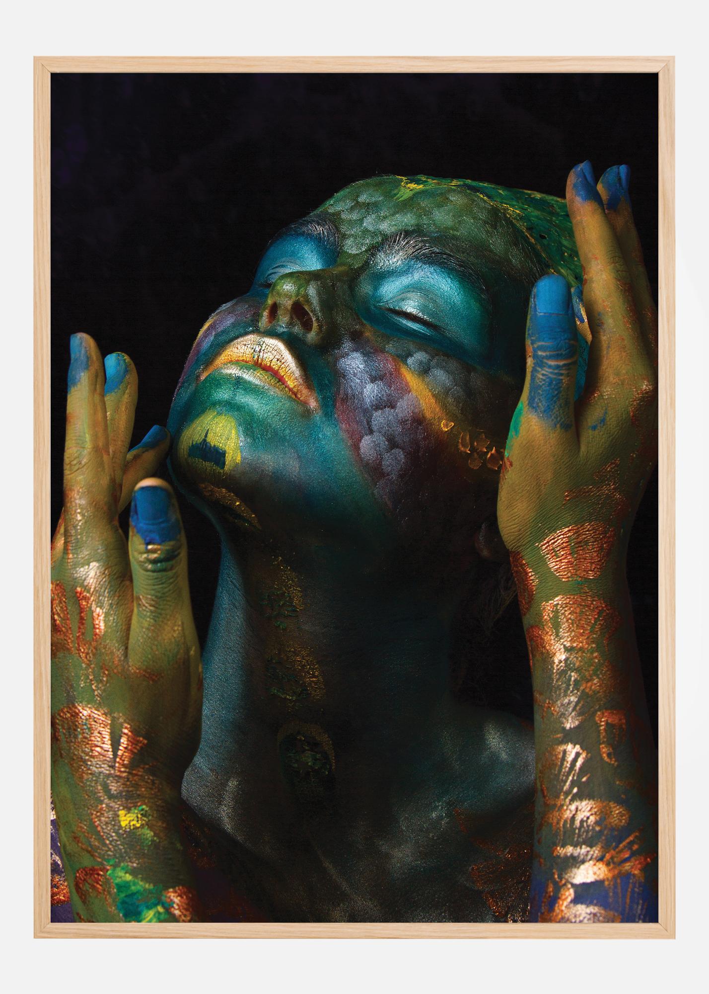 Monivärinen muotokuvajuliste naisesta, joka kallistaa päätään taaksepäin ja kehystää kasvonsa käsillään. Nainen on peitetty hehkuvilla kirkkailla maaleilla, jotka luovat kauniin sekoituksen riehakkaita värejä. Valitse yksi maalauksen väreistä ja sovita se seinällesi, niin saat lisää kirkkautta.