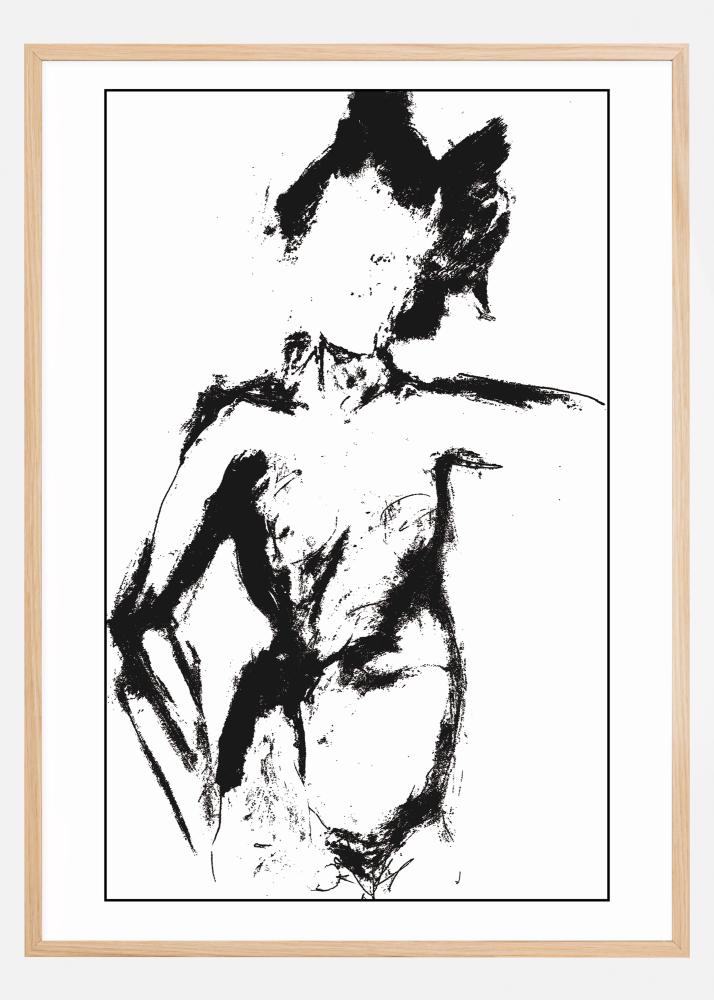 Mustavalkoinen juliste hahmopiirroksesta. Paksut rohkeat mustat siveltimenvedot ovat luoneet tämän naisen lähes chiaroscuro-tyyliin. Tuijota tätä hetken aikaa ja melkein odotat, että nainen liikahtaa.