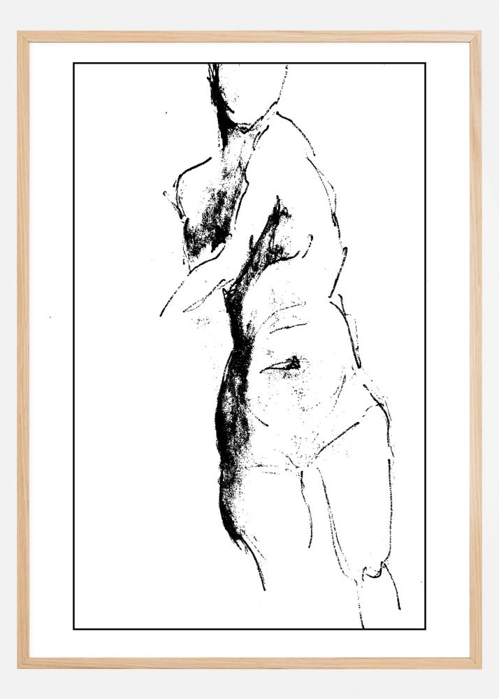 Mustavalkoinen juliste hahmopiirroksesta. Paksut rohkeat mustat siveltimenvedot ovat luoneet tämän naisen lähes chiaroscuro-tyyliin. Tuijota tätä hetken aikaa ja melkein odotat, että nainen liikahtaa.