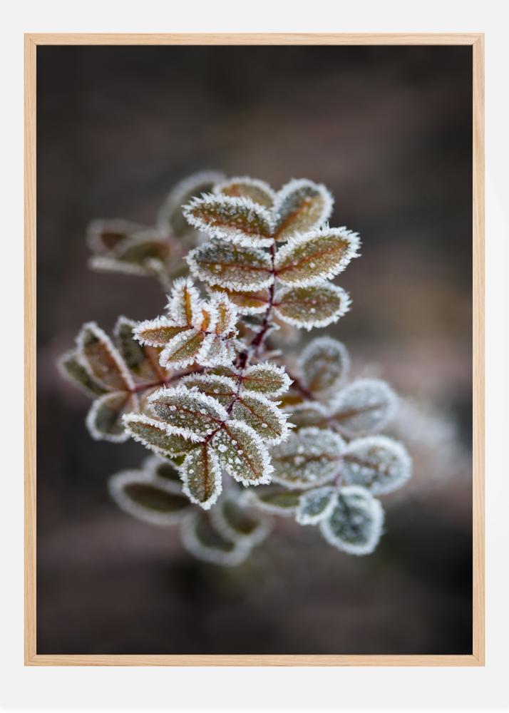 Fotografinen taide huurteisista ruusunlehdistä himmeää taustaa vasten. Lehtien punaiset suonet, vihreä väri ja valkoiset jääkiteet luovat hienoja kontrasteja ja ihanaa eloa. Botaninen juliste, joka sopii useimpiin koteihin ja sisustustyyleihin.
