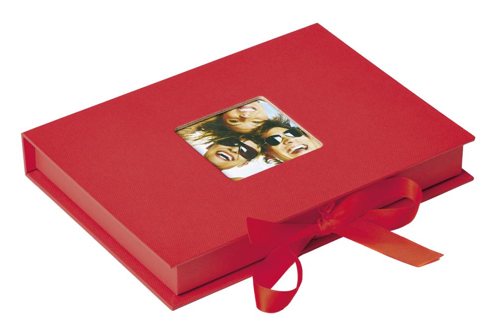 Hyvännäköinen valokuvalaatikko modernilla designilla ja herkullisella punaisella värillä. Siihen mahtuu 70 kuvaa, joiden maksimikoko on 13x18 cm. Kannessa on tilaa yhdelle kuvalle koossa 6x6 cm, ja sen ansiosta tuotteen personalisointi käykin helposti.