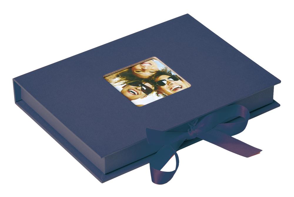 Hyvännäköinen valokuvalaatikko modernilla designilla ja herkullisella sinisellä värillä. Siihen mahtuu 70 kuvaa, joiden maksimikoko on 13x18 cm. Kannessa on tilaa yhdelle kuvalle koossa 6x6 cm, ja sen ansiosta tuotteen personalisointi käykin helposti.