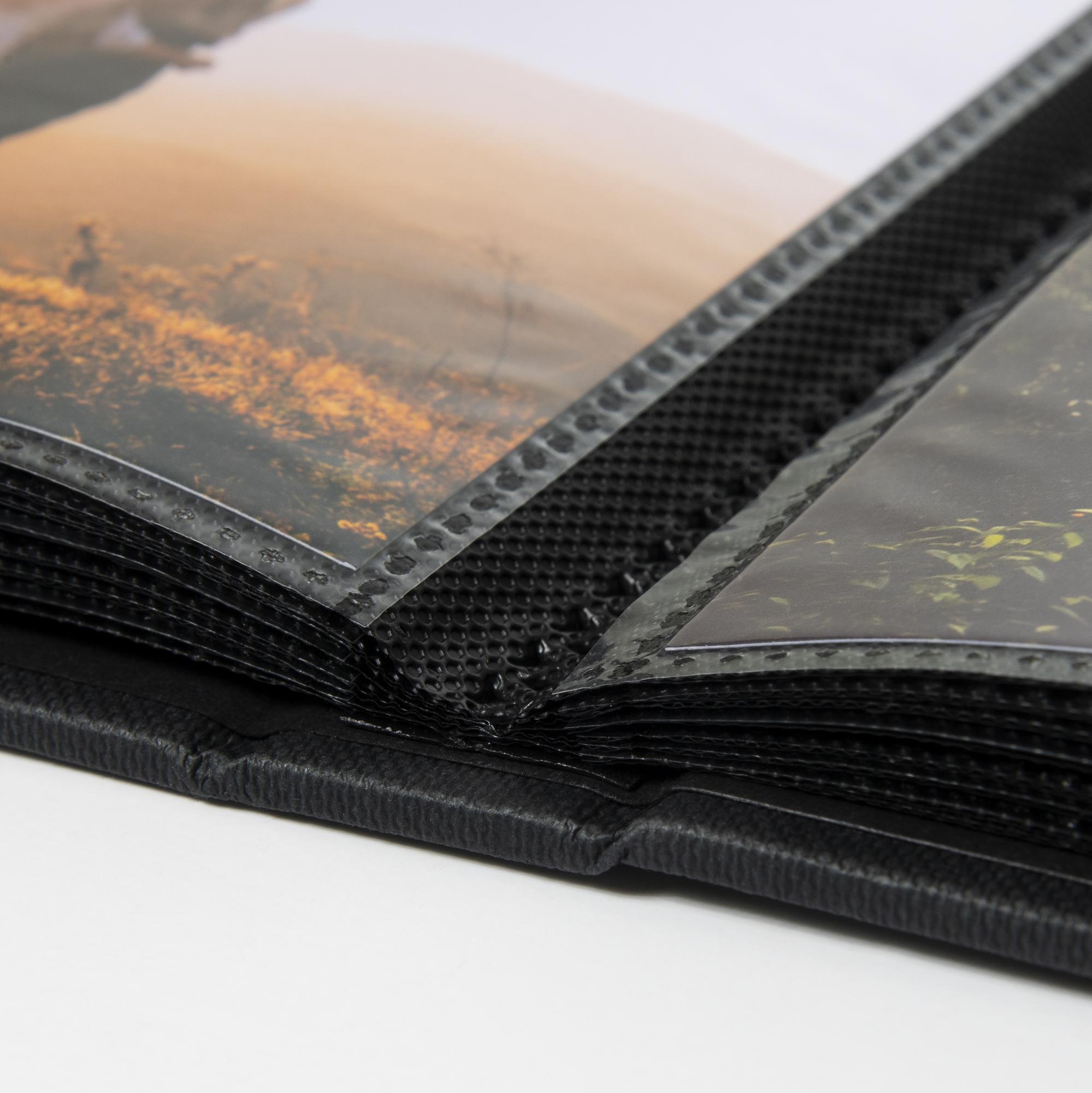 Albumissa on mustat hapottomasta paperista valmistetut lehdet. Kuvat laitetaan käteviin valokuvataskuihin.