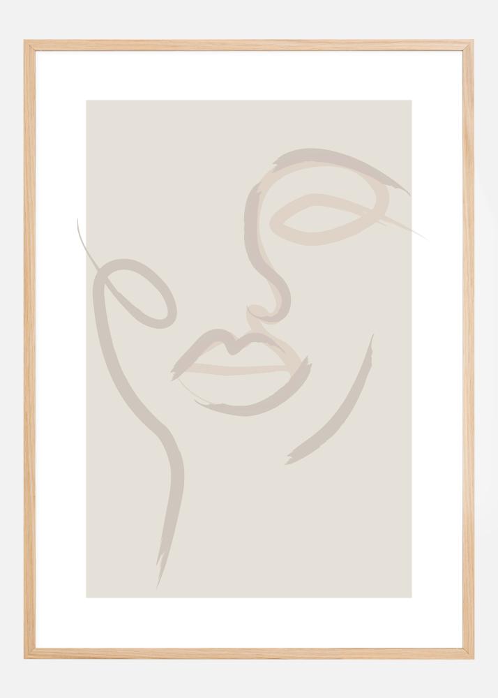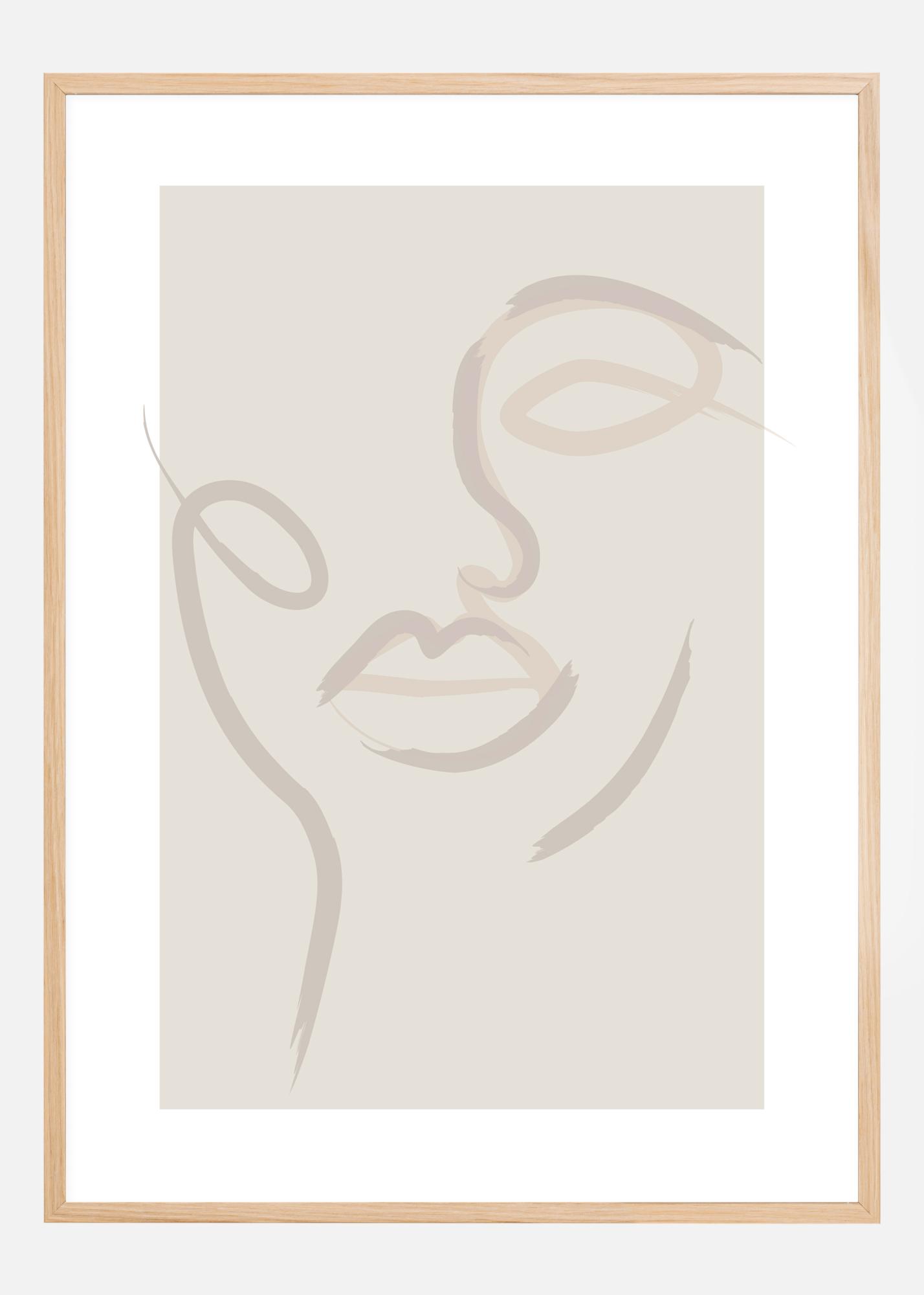 Kaunis muotokuvapainatus, joka on tehty yksinkertaisilla siveltimen vedoilla. Yksinkertaiset viivat, jotka muodostavat naisen kasvot beigellä taustalla. Yksinkertaisuutta parhaimmillaan. Kolmen yksinkertaisen siveltimenvedon avulla saatat kysyä itseltäsi, kuka tämä kaunis nainen on.