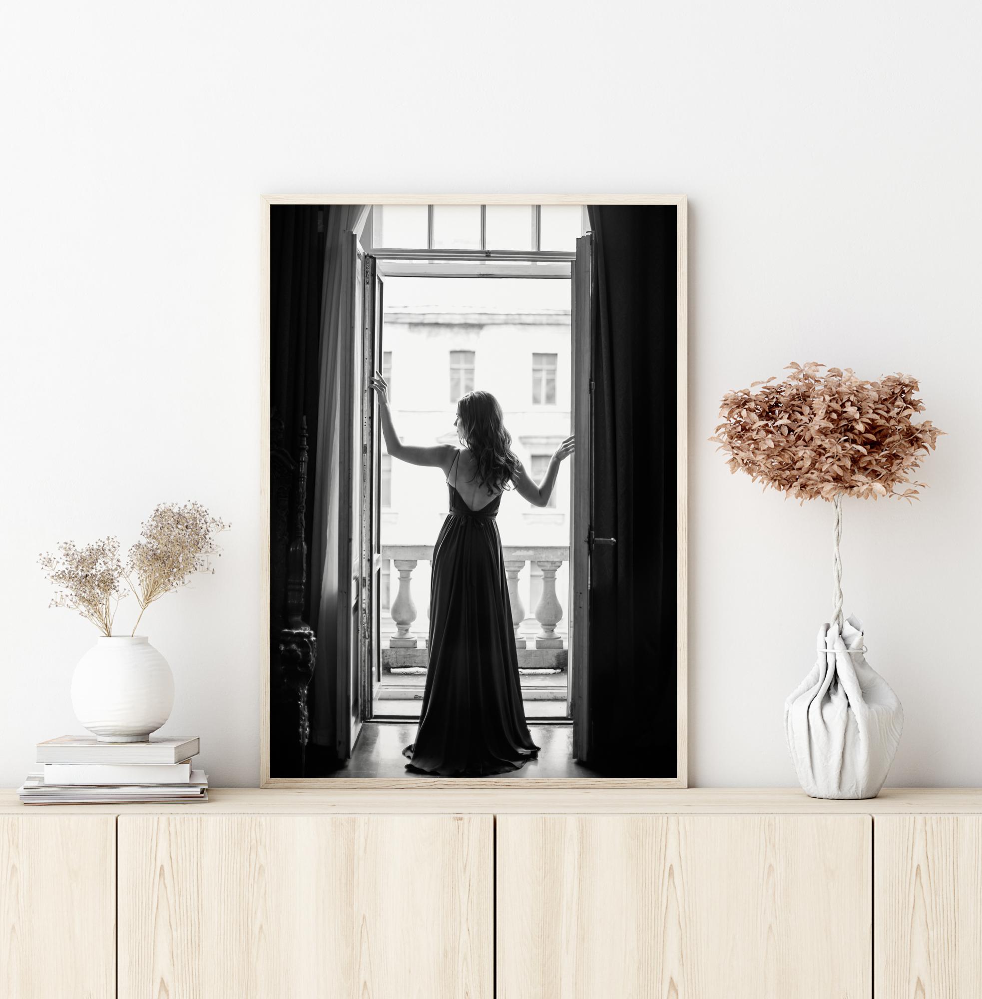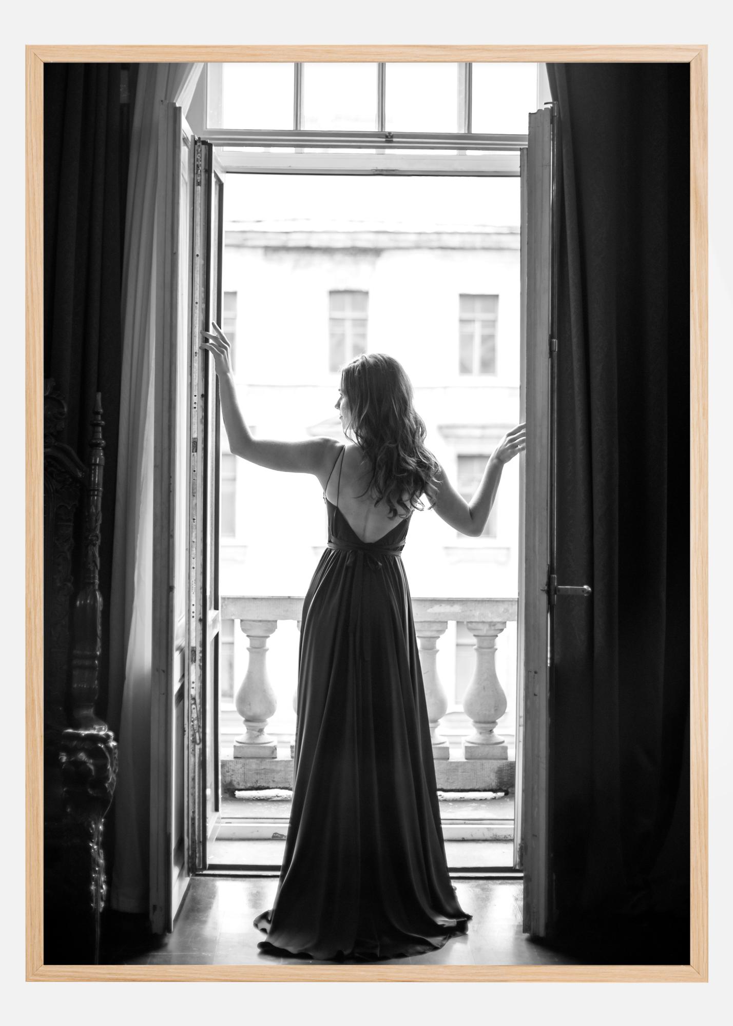 Mustavalkoinen valokuva naisesta pitkässä mekossa, seisomassa auki olevien parvekeovien edessä, katsoen ulos päivään. Hänen edessään häämöttävät kuluneet betonipylväät ja kulunut vanha julkisivu. Juliste, joka henkii ihanaa sekoitusta kaunista ja elävää kontrastina vanhaan ja säiden kuluttamaan.