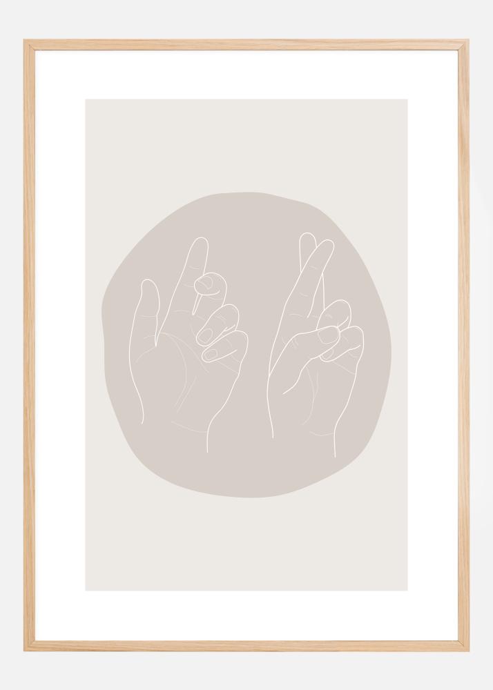 Yksinkertainen vedos kahdesta vasemmasta kädestä pyöreällä beigen värisellä muodolla. Ympyrä on asennettu nudenväriselle taustalle siten, että molemmat kädet osoittavat tulosteen yläosaa kohti. Kädet ovat rennot, mikä luo rauhallisen tunnelman kotiisi. Täydellinen tuloste työhuoneeseen.