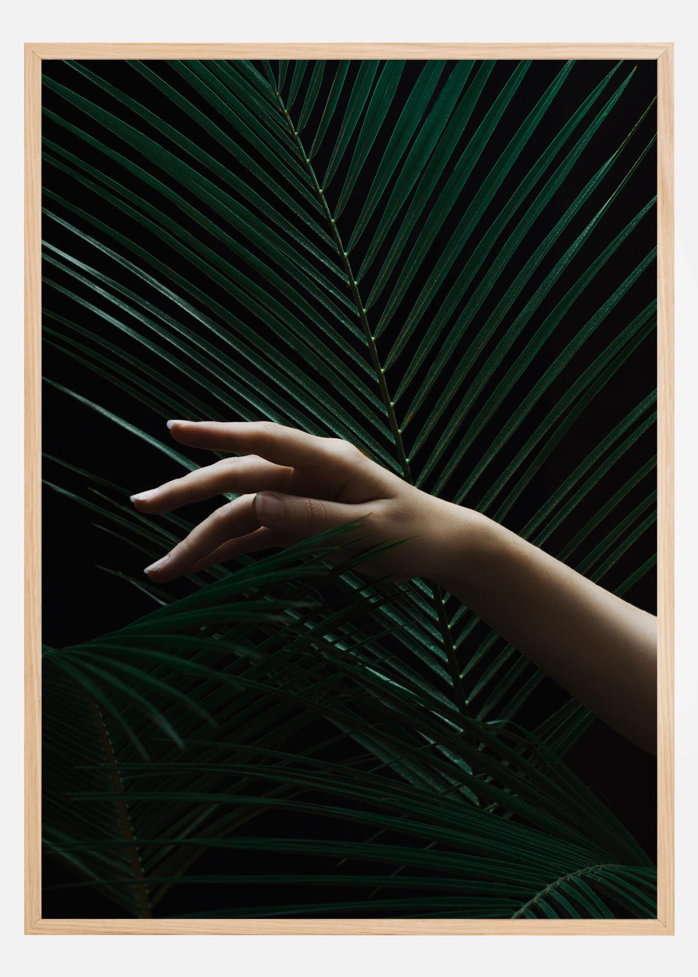 Botaninen valokuva vihreistä, palmun kaltaisista oksista mustaa taustaa vasten. Ojennettu käsi tuo elävän ja kontrastisen elementin. Tumma juliste, joka sopii täydellisesti suurelle tauluseinälle.