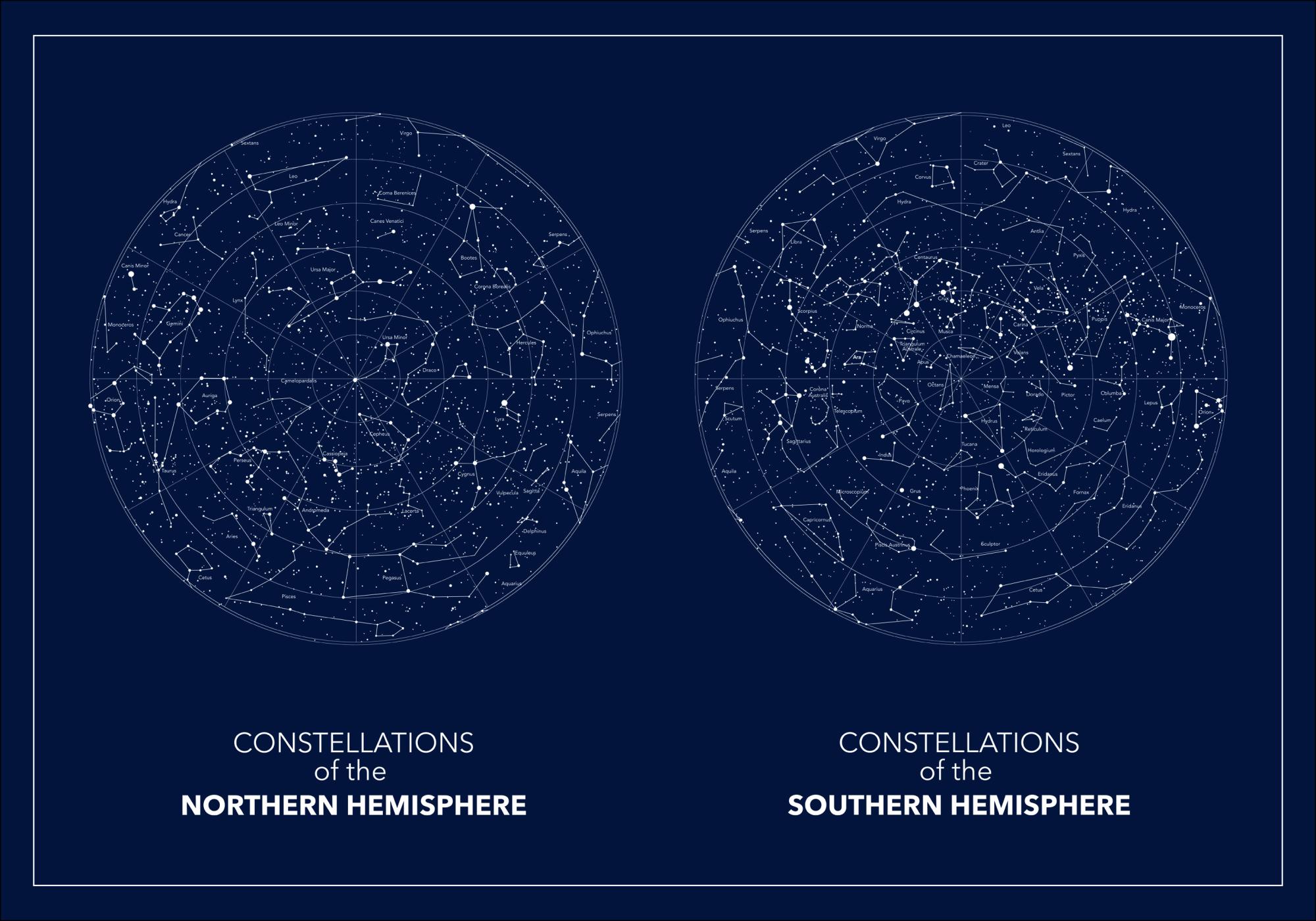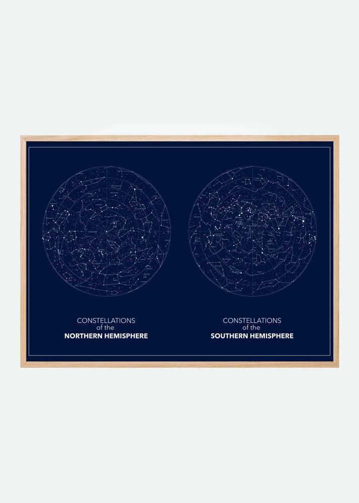 Kiehtova tummansininen juliste pohjoisesta ja eteläisestä pallonpuoliskosta. Molemmat kuvat ovat sijoitettu vierekkäin. Tummansiniselle taustalle asetetut tähtikuviot on hennosti hahmoteltu valkoisella. Ripusta tämä juliste työhuoneeseesi luomaan äärettömyyden tunnetta.