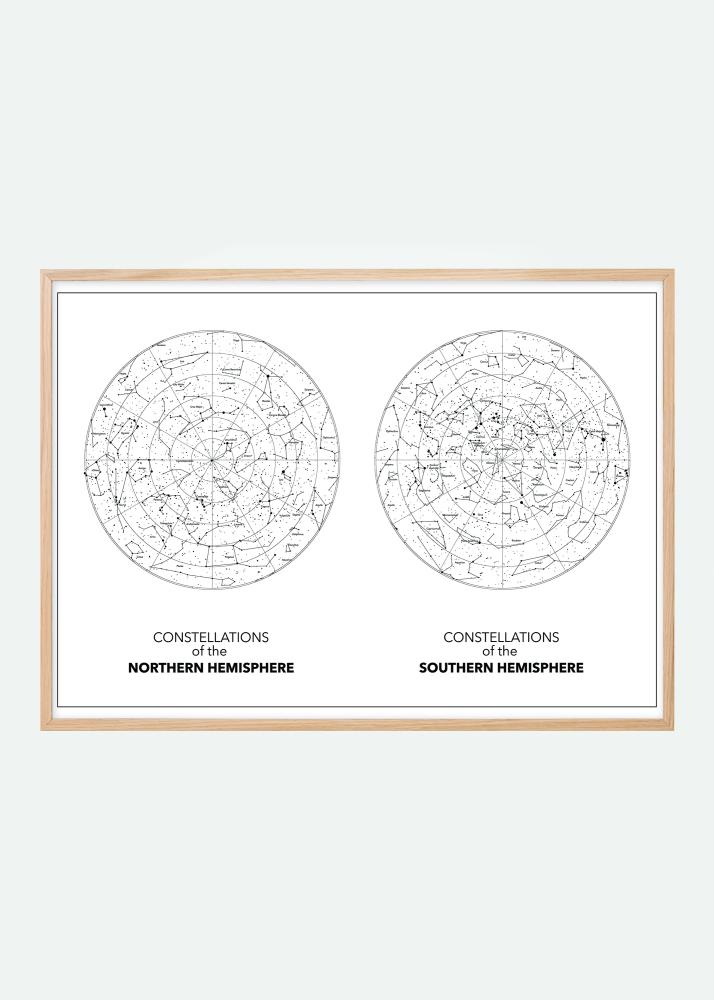 Mustavalkoinen juliste pohjoisesta ja eteläisestä pallonpuoliskosta. Valkoisella pohjalla olevat tähtikuviot ovat hennosti hahmoteltu mustalla. Vierekkäin asetettuna voit ihailla tähtien salaperäisyyttä. Ripusta tämä juliste työhuoneeseesi ja luo äärettömyyden tunnetta.