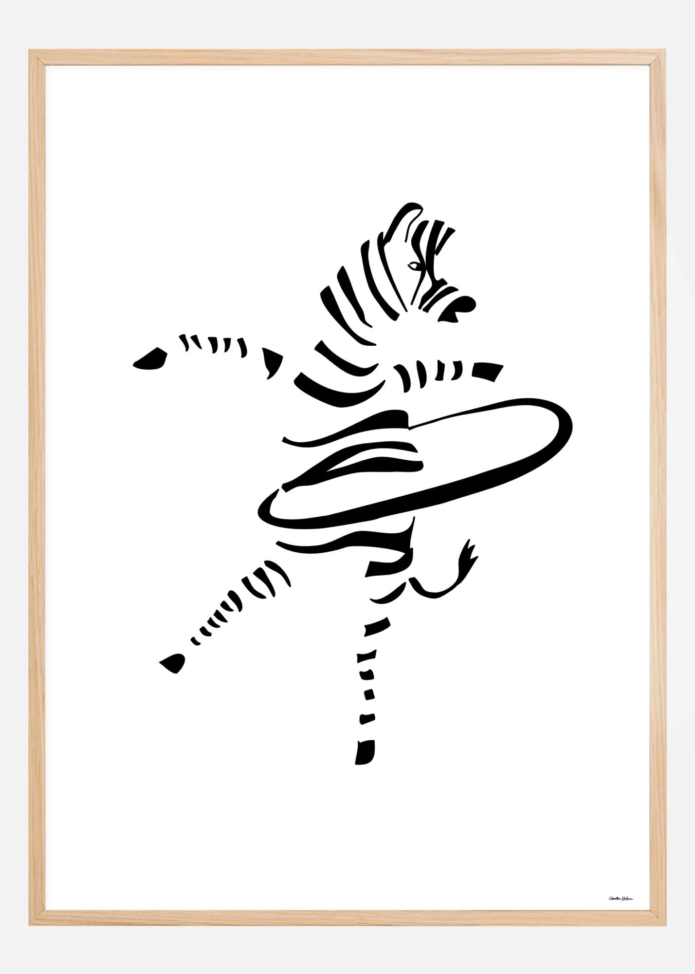 Minimalistinen muotokuva tanssivasta seeprasta. Valkoisella pohjalla mustat siveltimenvedot muodostavat taitavasti seepran muodon. Tämä suloinen seepra seisoo takajaloillaan ja pyörittää iloisesti hulavannetta. Yksinkertainen mutta hauska painatus, joka sopii paljaalle seinälle ripustettavaksi.