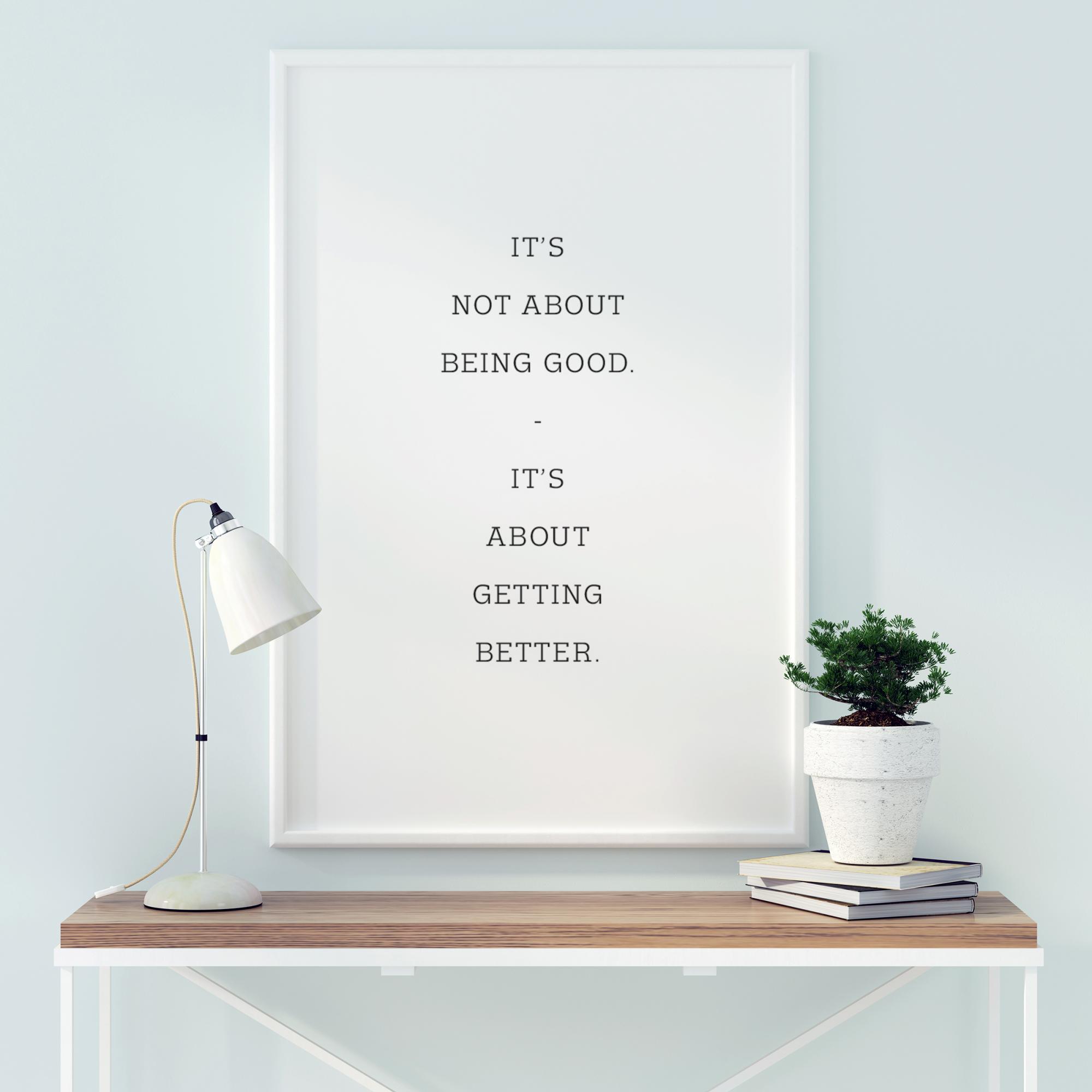 Mustavalkoinen motivaatiojuliste, jossa on yksinkertainen, mutta tehokas viesti. Kyse ei ole siitä, että olet hyvä, vaan siitä, että tulet paremmaksi. Yksinkertainen kannustava viesti, joka rohkaisee kohtaamaan elämän rauhallisesti tavoitteena parantaa sitä päivittäisissä askareissa. Kannustava viesti lukijalle.