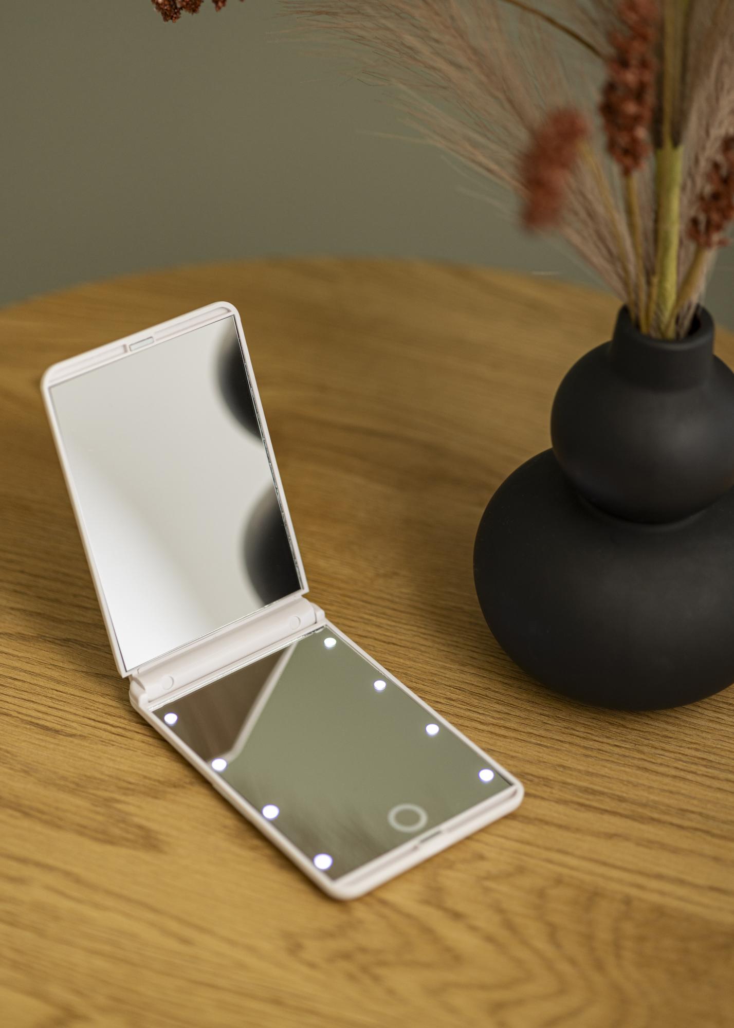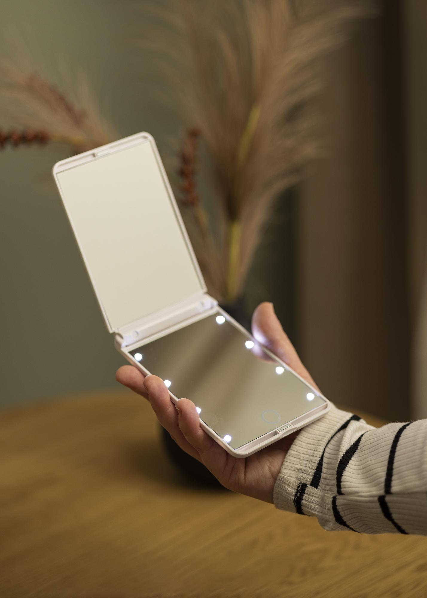 Tällä elegantilla valkoisella ja taitetavalla meikkipeilillä voit tarkistaa peilikuvaasi missä vain. Kirkkaan meikkipeilin reunoihin on asennettu 8 voimakasta LED-lamppua. Yläpeilissä on kaksinkertainen suurennos. Valaistus on himmennettävä ja sen miellyttävän valkoista värilämpötilaa 3000K välillä voi säätää näytön kosketusnapin avulla.