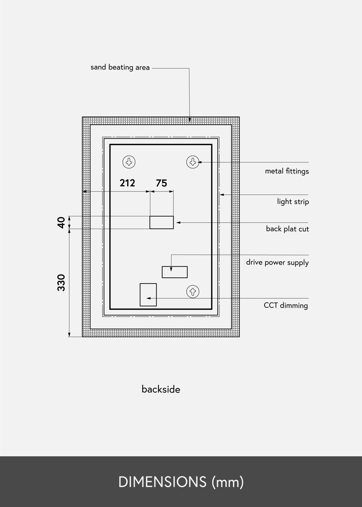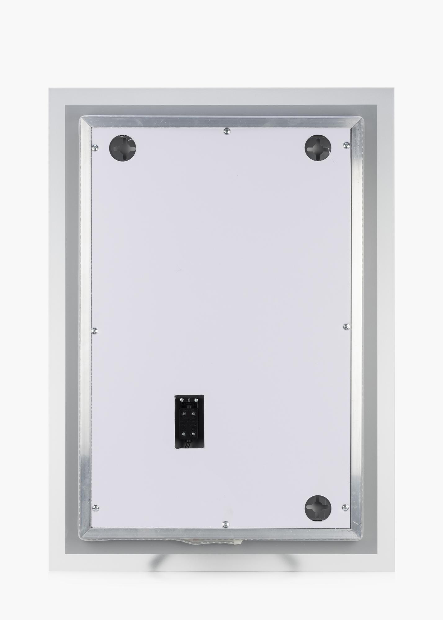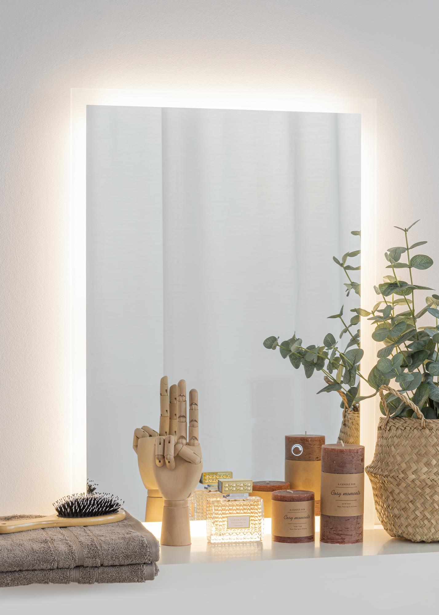 Skandinaavista muotoilua KAILAlta. Tämän suorakulmaisen peilin reunat ovat huurrettua lasia. Reunan takaosaan on integroitu LED-valaistus, joka luo peilin ympärille kauniin 3000 kelvinasteen lämpimän valkoisen valon. Valon voi himmentää koskettamalla muutaman sekunnin ajan vesitiiviin näytön kosketusnäppäintä. Meikkipeilissä on muistitoiminto, joka automaattisesti tallentaa viimeisimmän valosäädön. LED on energiaa säästävä valolähde, joka luo tasaisen luonnollisen valon.
