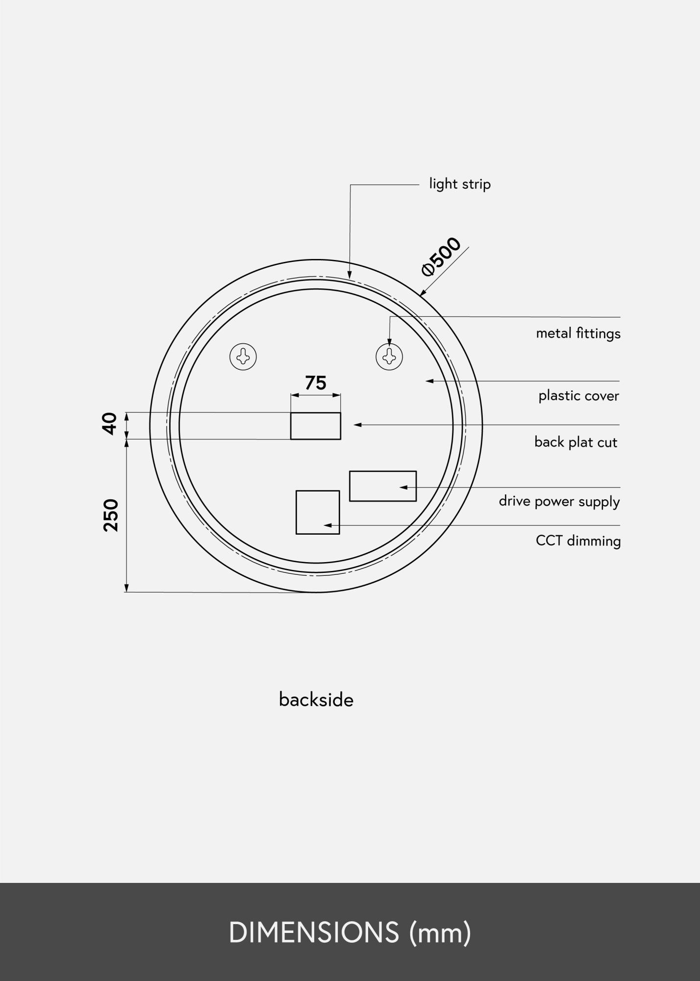 Peili on hyväksytty kylpyhuonekäyttöön mutta sen ajaton ja tyylikäs muotoilu soveltuu myös kodin muihin huoneisiin. Peilin halkaisija on 50 cm ja syvyys ainoastaan 3 cm. Peili on varustettu seinäkiinnikkeillä. Peili on tarkoitettu kiinteään asennukseen ja liitettäväksi valonkatkaisijaan. Jotta peili toimisi oikein, tulee se yhdistää tavalliseen sähkökatkaisijaan, ei himmentimeen.