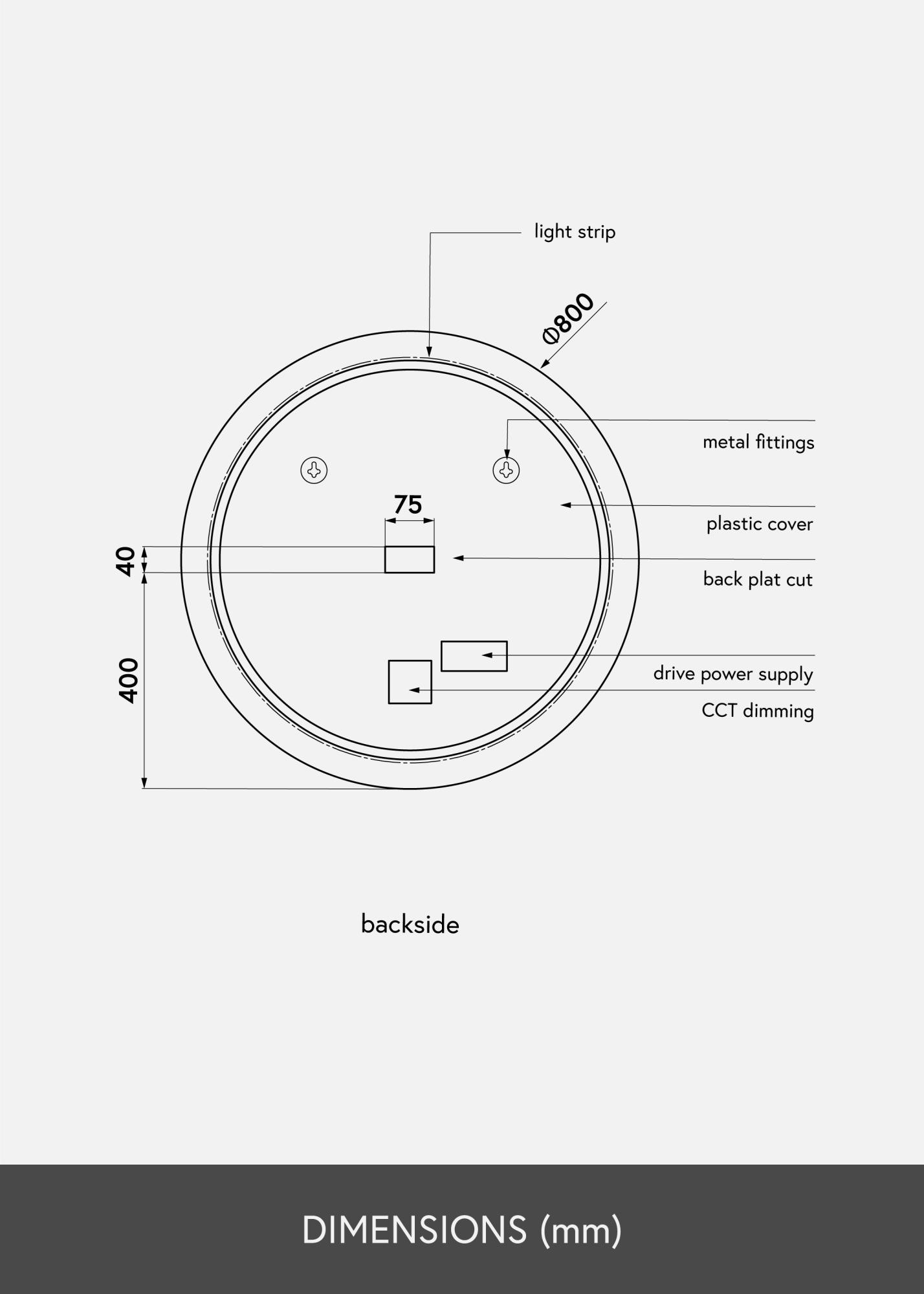 Peili on hyväksytty kylpyhuonekäyttöön mutta sen ajaton ja tyylikäs muotoilu soveltuu myös kodin muihin huoneisiin. Peilin halkaisija on 80 cm ja syvyys ainoastaan 3 cm. Peili on varustettu seinäkiinnikkeillä. Peili on tarkoitettu kiinteään asennukseen ja liitettäväksi valonkatkaisijaan. Jotta peili toimisi oikein, tulee se yhdistää tavalliseen sähkökatkaisijaan, ei himmentimeen.