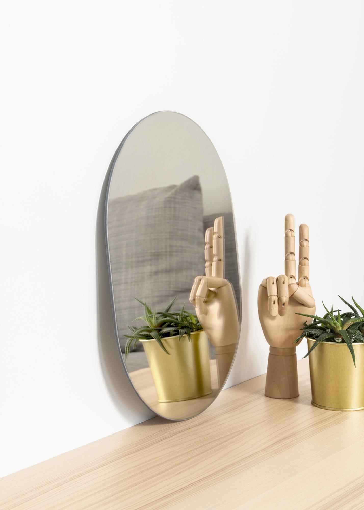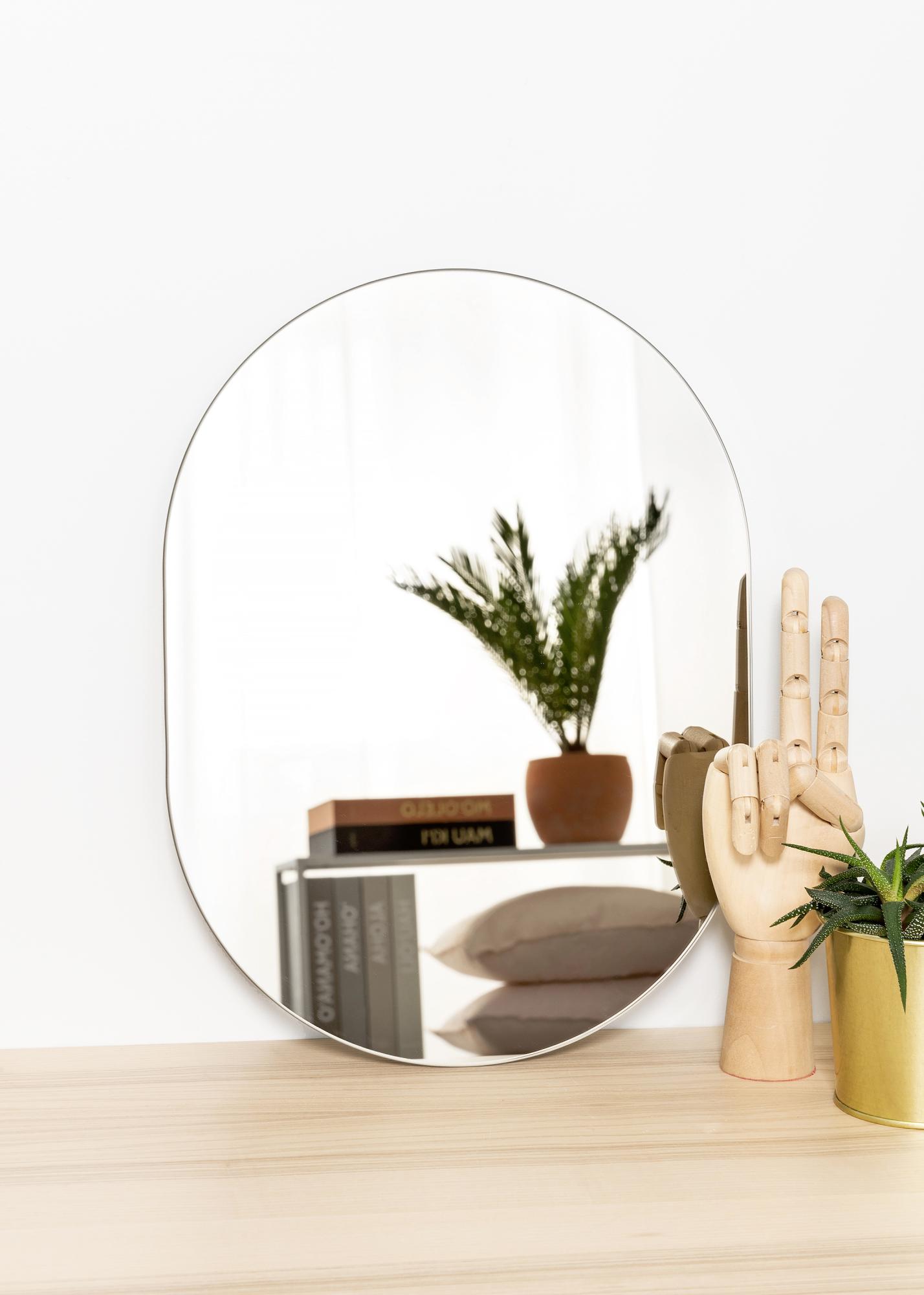 Ovaalin muotoisessa peilissä on yhtä käytännölliset mittasuhteet kuin suorakulmaisessakin, mutta lisäksi siitä löytyy myös pyöreän peilin eleganssia - toisin sanoen ovaalin muotoinen peili on aivan erinomainen valinta! Lisäksi tämä ovaalin muotoinen peili on myös erittäin ohut, eikä siinä ole kehystä, mikä vahvistaa sen eleganttia profiilia entisestään.