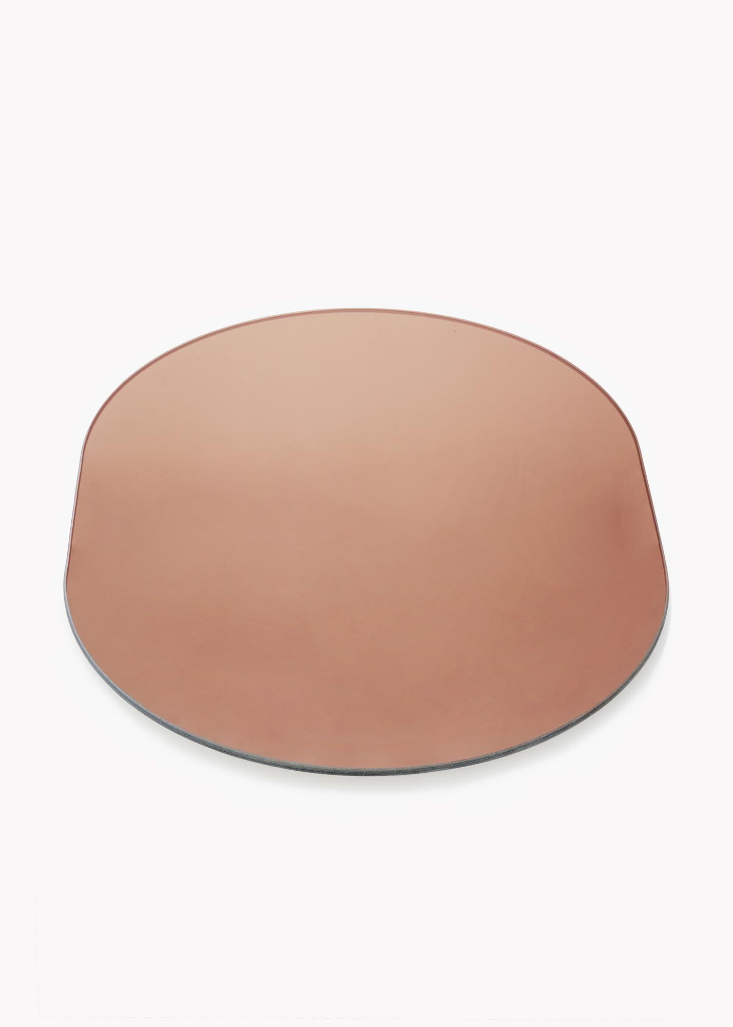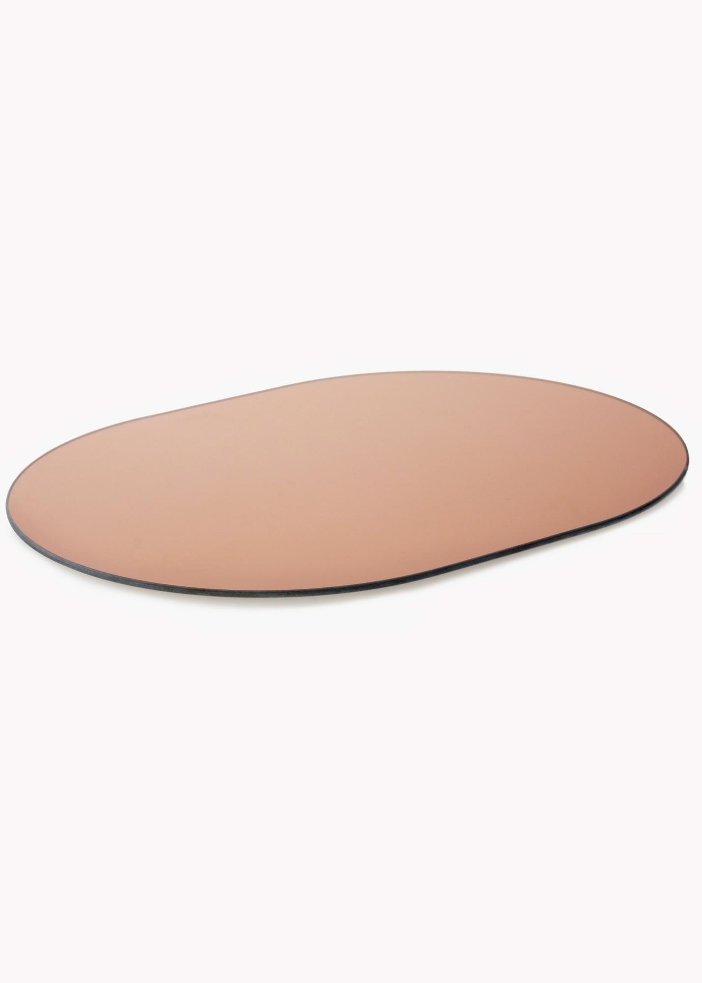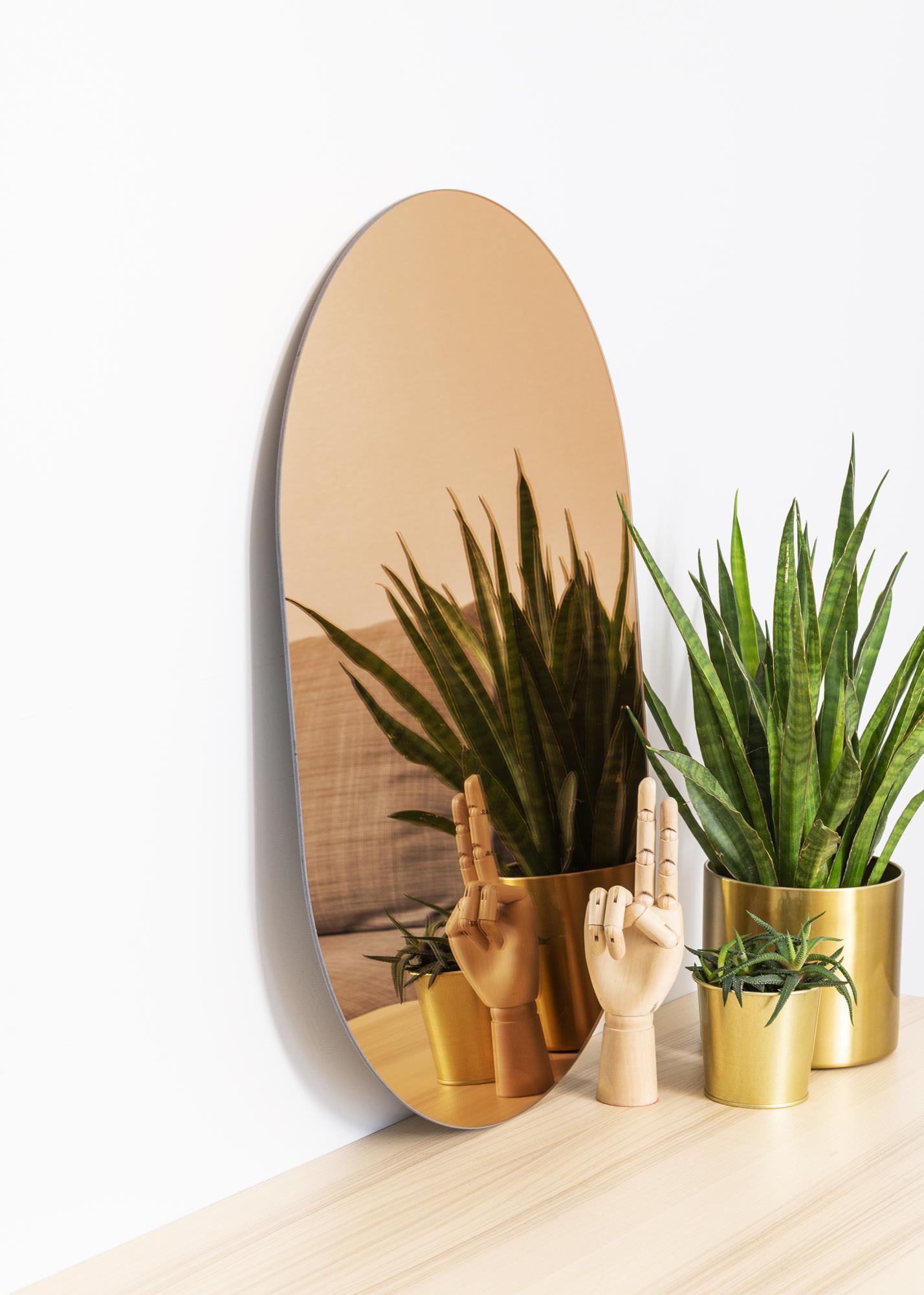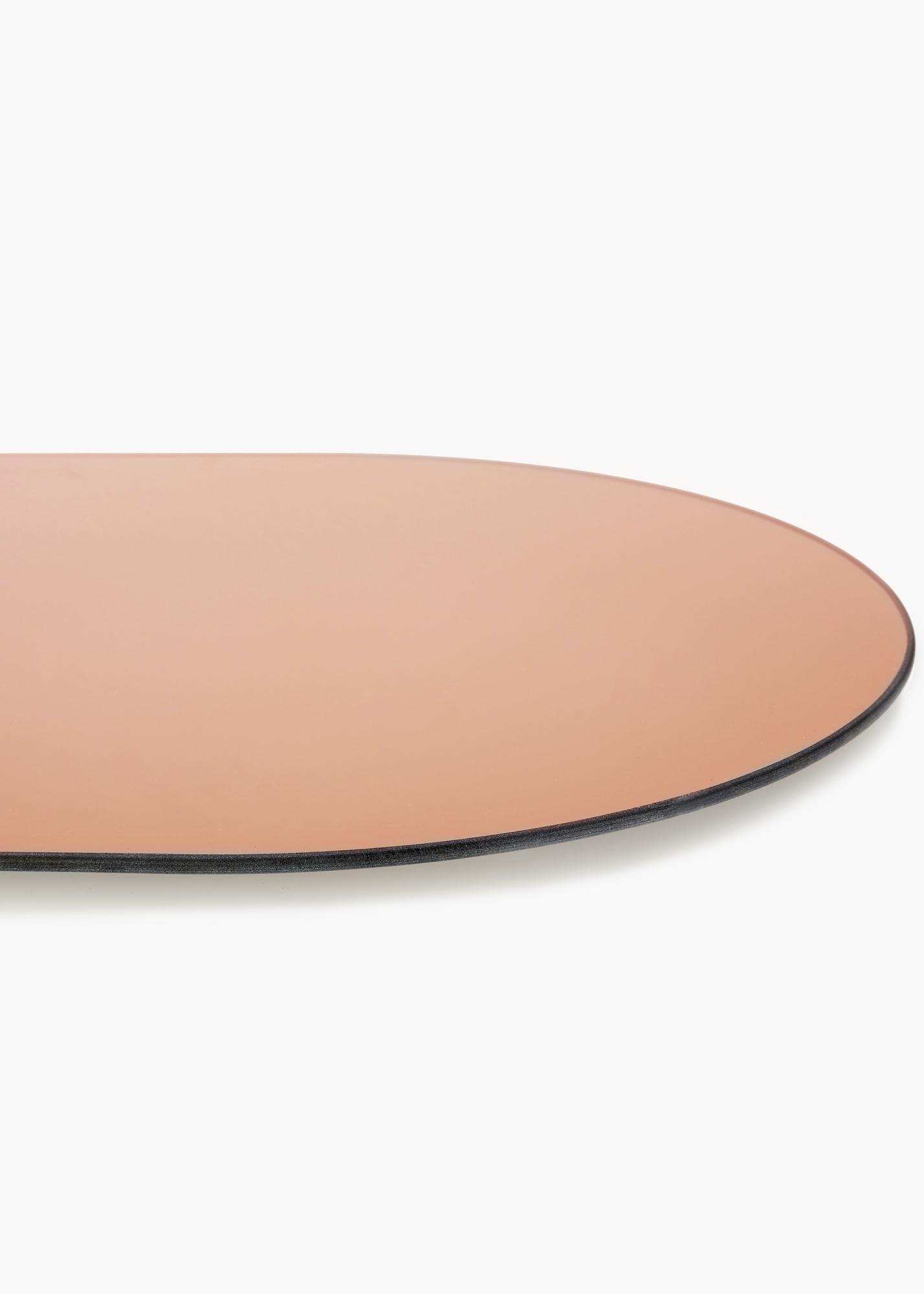 Tämä ovaalin muotoinen peili on erittäin ohut eikä siinä ole lainkaan kehystä, mikä luo trendikkään ja elegantin vaikutelman. Trendikkyyttä vahvistaa tyylikäs ruusukullan sävyinen peililasi. Tämä yksityiskohta tekee peilistä hyvin huomiota herättävän, samalla kun se säilyttää elegantin profiilinsa.