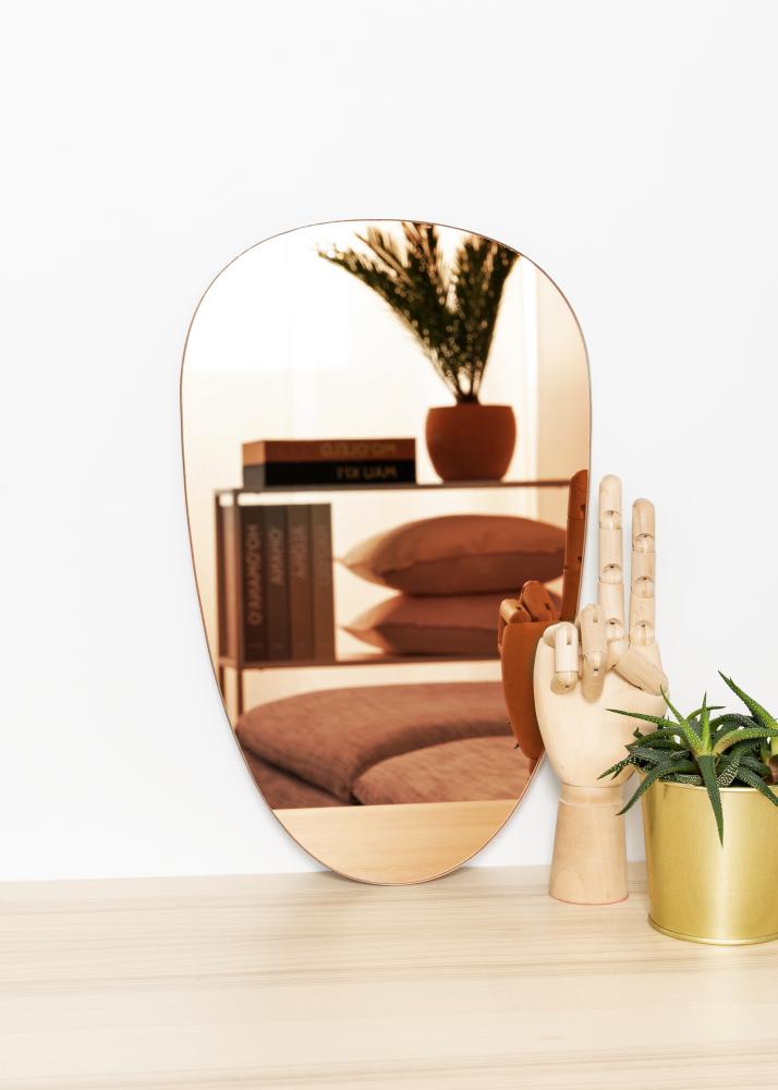 Tämä trendikäs, epäsymmetrinen peili tuo kotisi sisustukseen viehättävän lisän! Peilin pehmeä ja lähes ovaali muoto tuo siihen runsaasti eleganssia ja lisäksi vahvistaa sitä tosiasiaa, että peili on huomattavan ohut eikä siinä ole kehystä. Peililasi on sävytetty lämpimällä ruusukullan värillä, mikä tuo kokonaisuuteen suuren vaikutuksen ja korostaa peilin erittäin modernia profiilia.