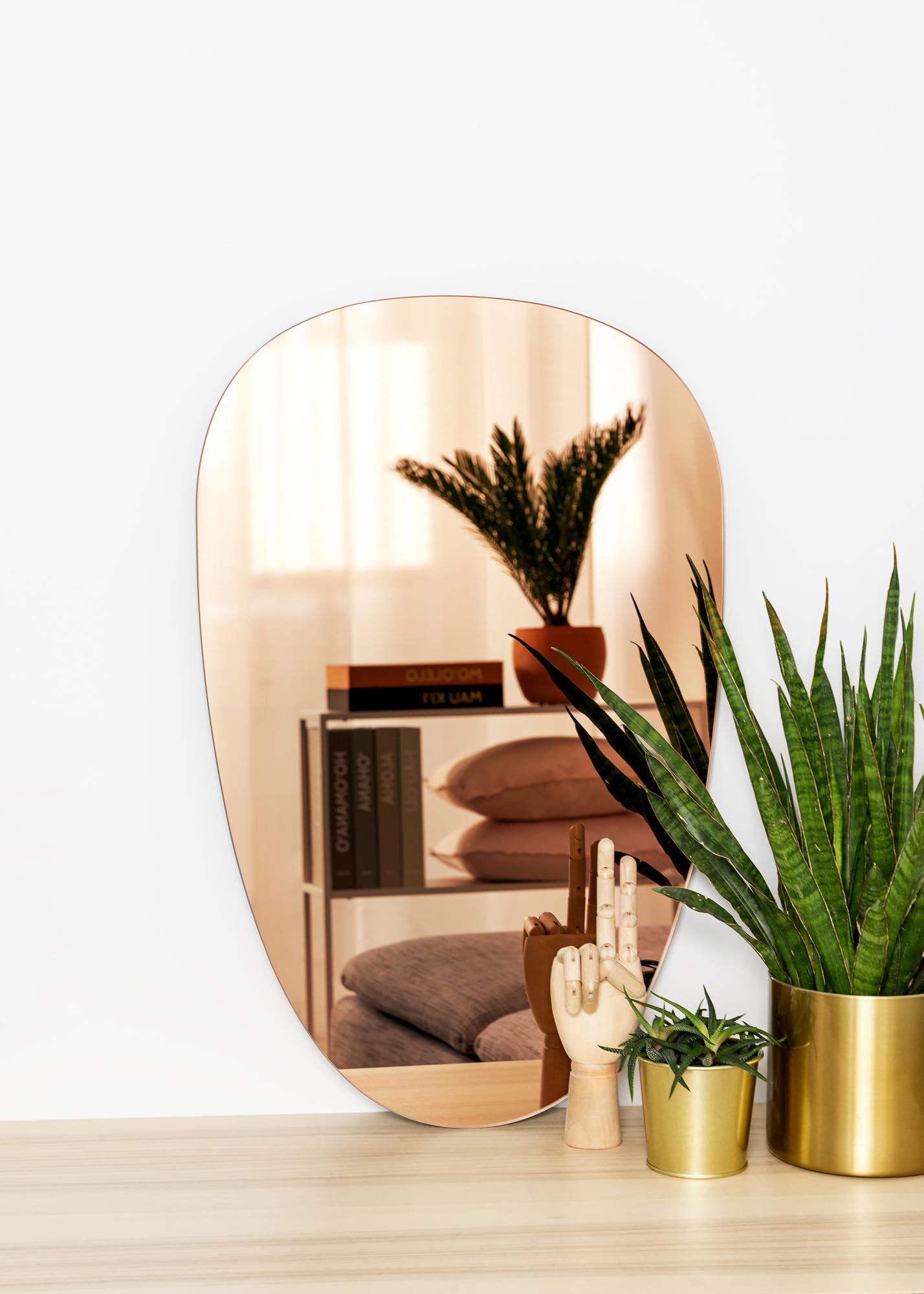 Ota mukaan sisustukseesi sekä käytännöllisyys että tyylikäs ruotsalainen design! Tällä peilillä - sekä sen pehmeän elegantilla muodolla -luot kotiisi luokseen kutsuvan ja leppoisan tunnelman. Peili on epäsymmetrisen ovaali ja erittäin ohut, eikä siinä ole lainkaan kehystä, mikä luo siron ja tyylikkään profiilin. Lisäksi peilissä on ruusukullan sävyinen peililasi, joka tekee peilistä todella trendikkään yksityiskohdan kotisi sisustukseen.